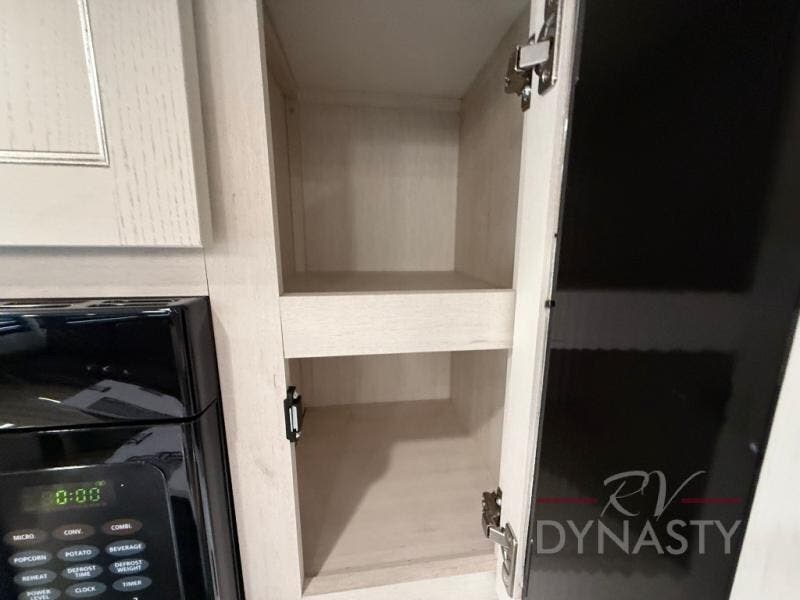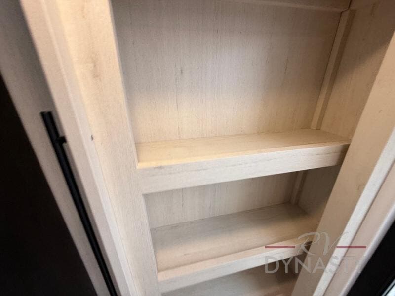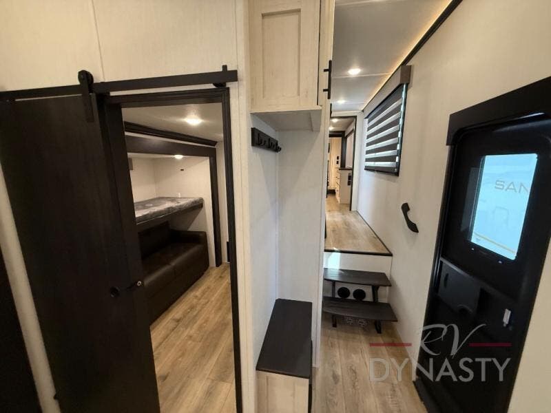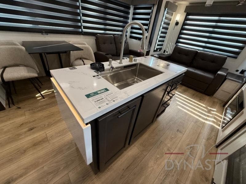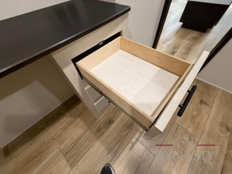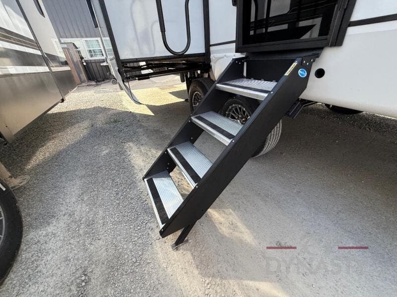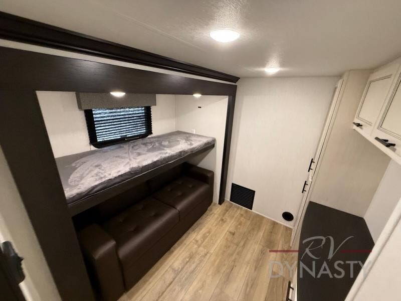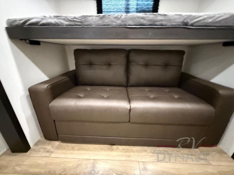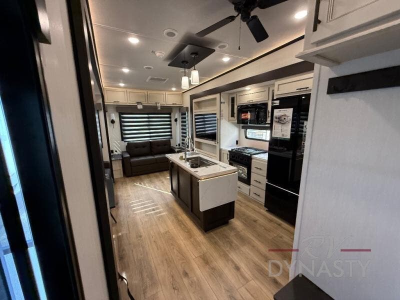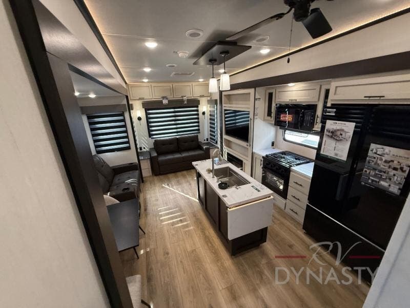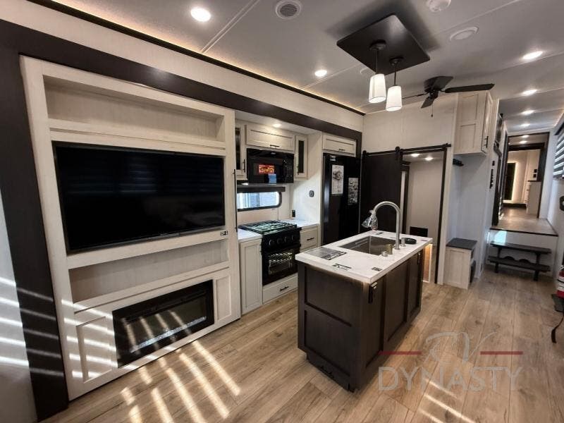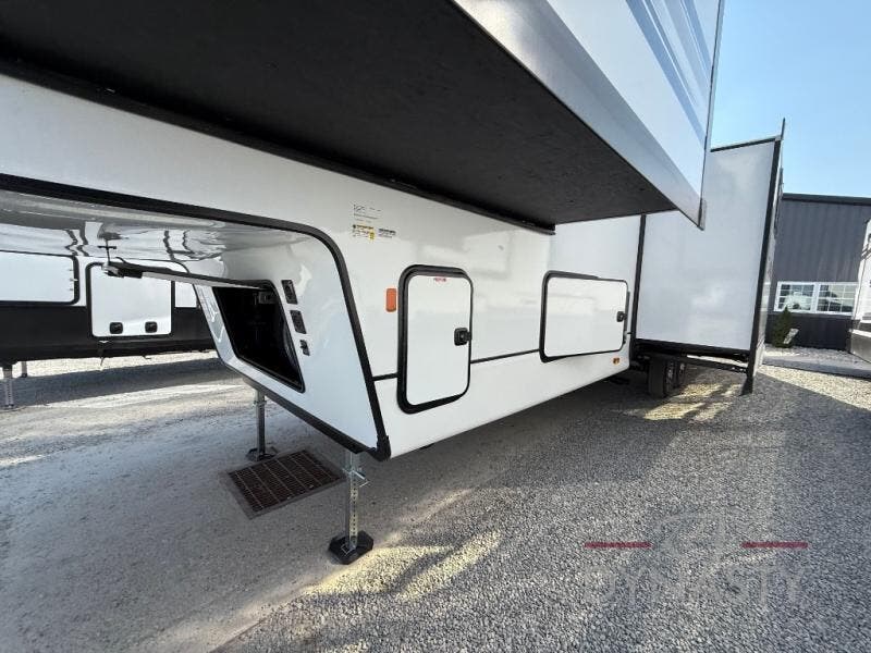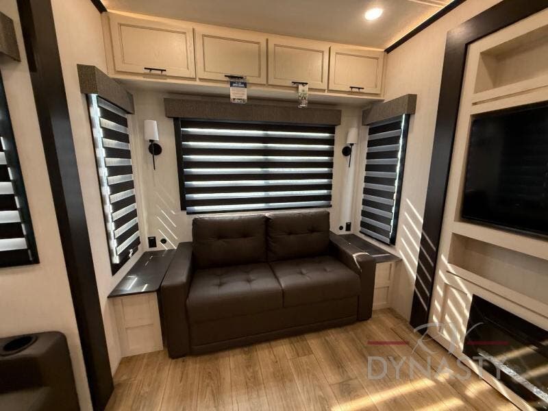 There is much to love in this fifth wheel! Starting with the second bedroom which has a slide that houses a flip-up bunk above a tri-fold sofa across from a desk with drawers, a drop zone, and a wardrobe, plus above all of that is a storage/bunk loft. The rear living area includes a tri-fold sofa, a TV with a hidden pantry behind, and theater seating for two making this space another area at night for guests. In the morning, you can prepare breakfast on the kitchen island, then dine together at the versatile dinette/desk. The full bath will allow you to stay clean throughout your trip, and you'll feel right at home in the front private bedroom with a camper king bed, a dresser, and front wardrobe. Outside, a kitchen and two power awnings create an inviting space!
