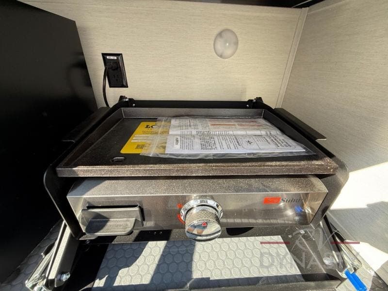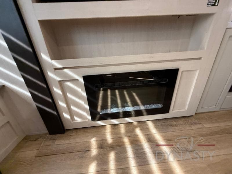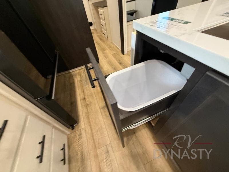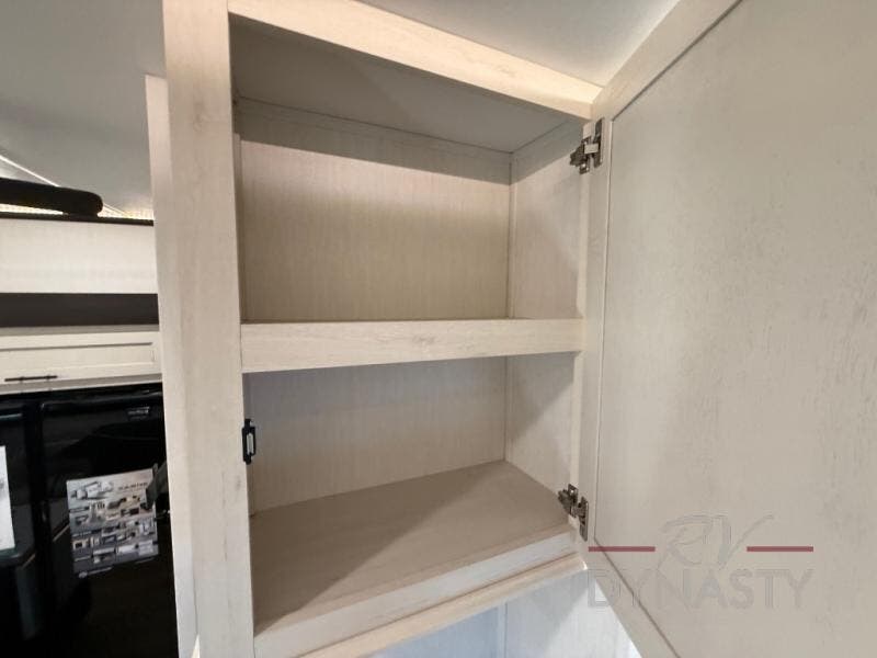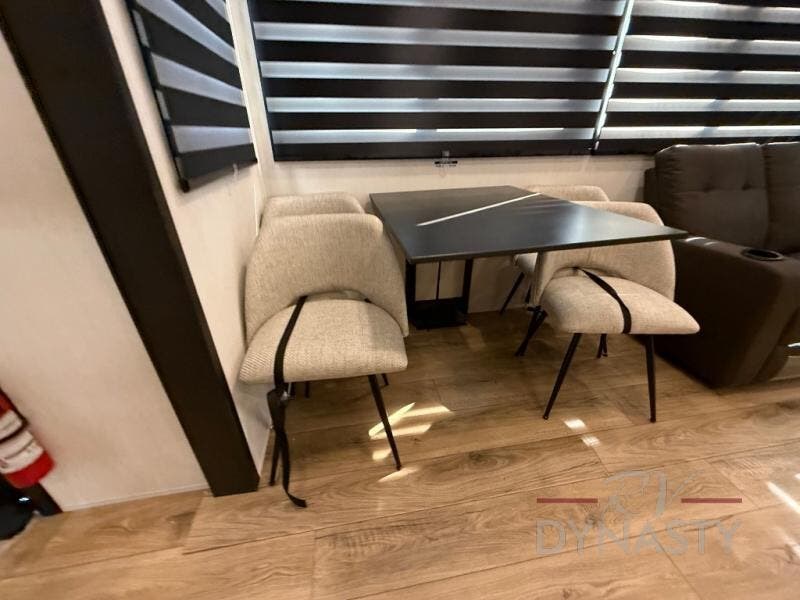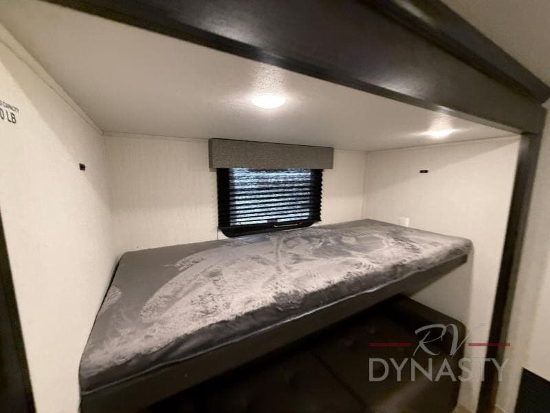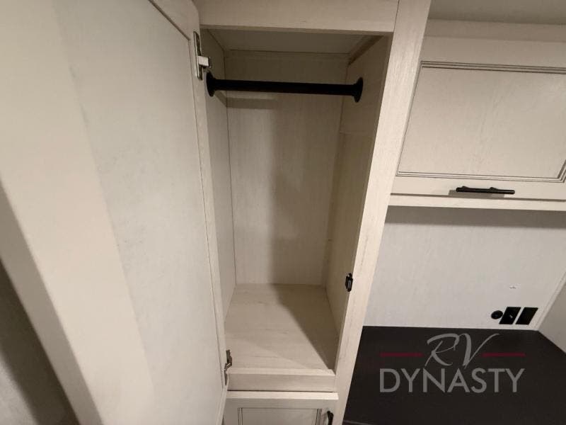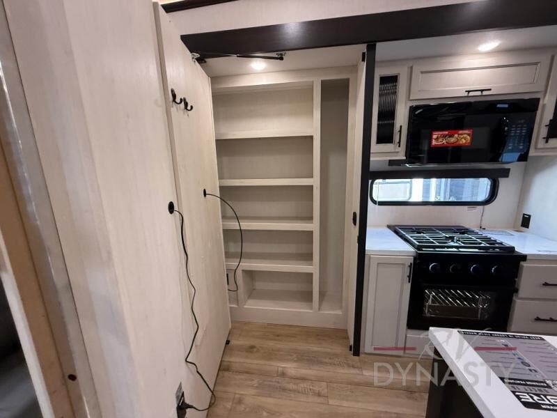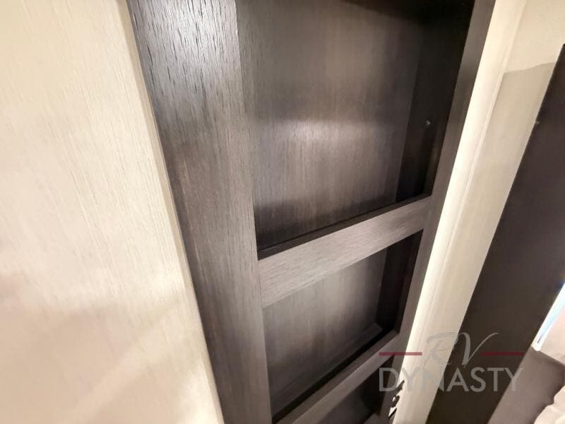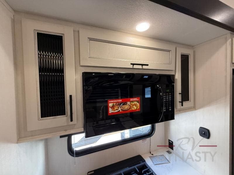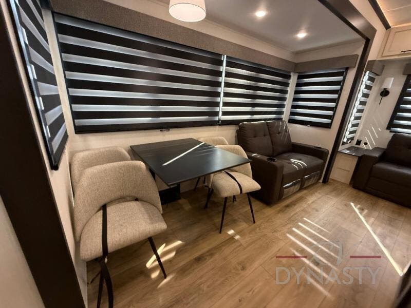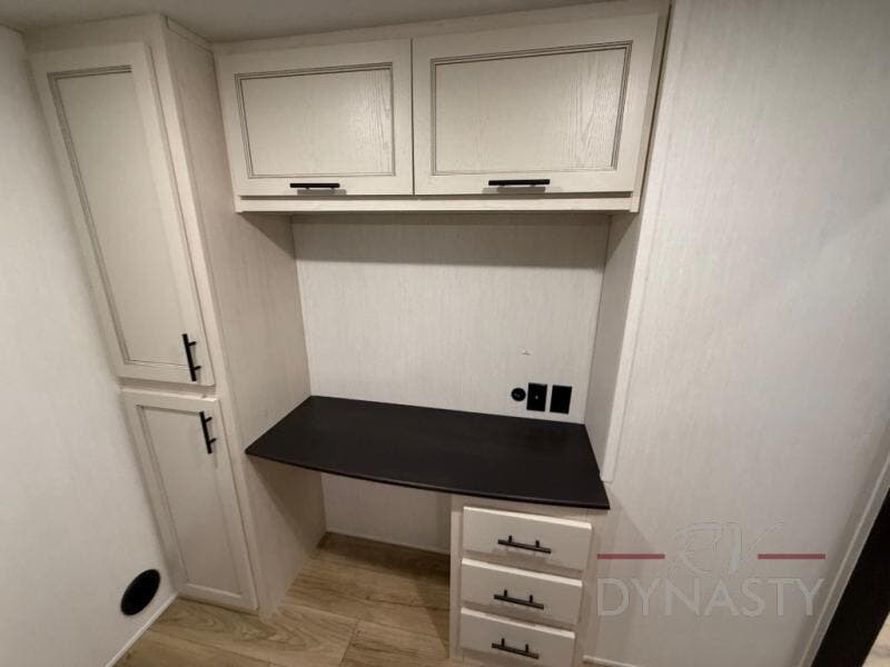 There is much to love in this fifth wheel! Starting with the second bedroom which has a slide that houses a flip-up bunk above a tri-fold sofa across from a desk with drawers, a drop zone, and a wardrobe, plus above all of that is a storage/bunk loft. The rear living area includes a tri-fold sofa, a TV with a hidden pantry behind, and theater seating for two making this space another area at night for guests. In the morning, you can prepare breakfast on the kitchen island, then dine together at the versatile dinette/desk. The full bath will allow you to stay clean throughout your trip, and you'll feel right at home in the front private bedroom with a camper king bed, a dresser, and front wardrobe. Outside, a kitchen and two power awnings create an inviting space!