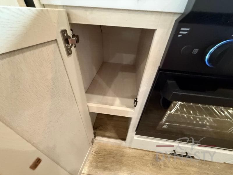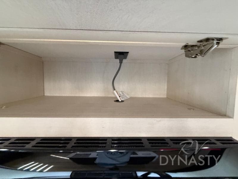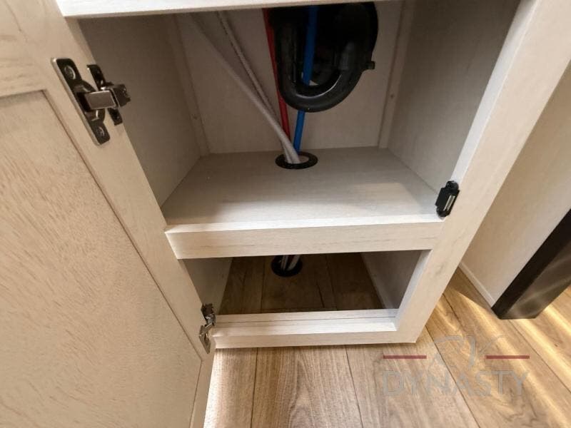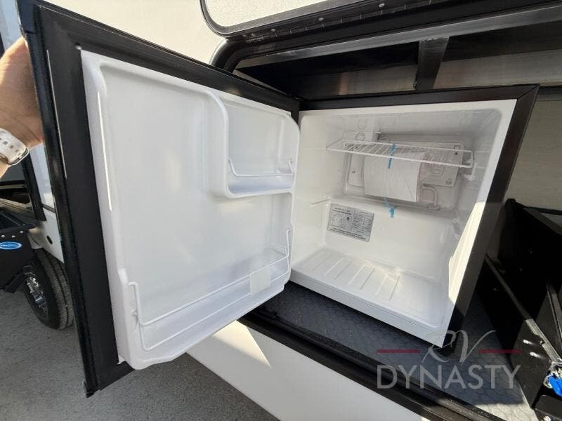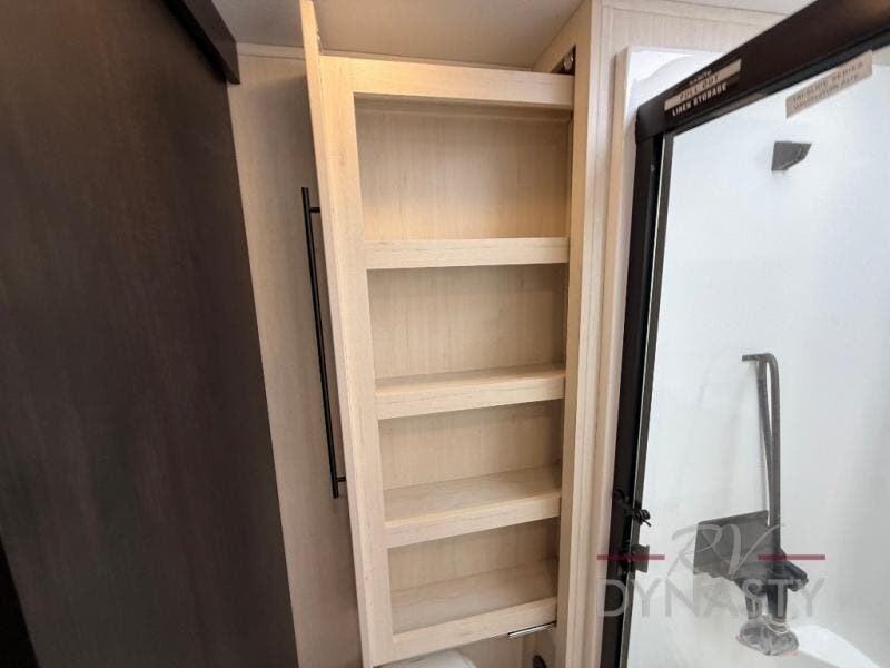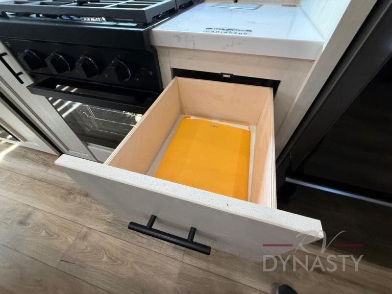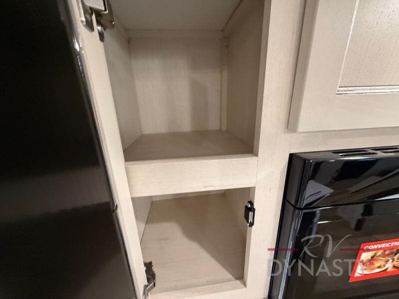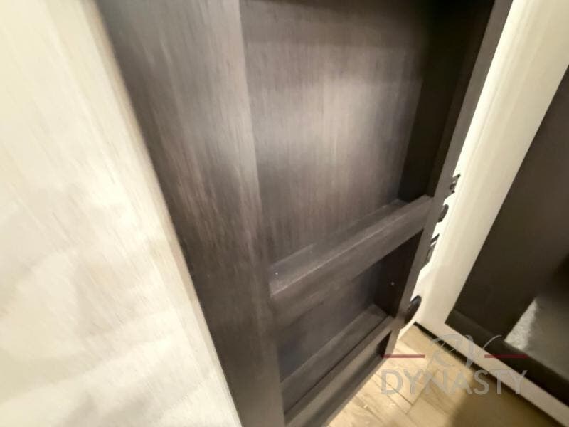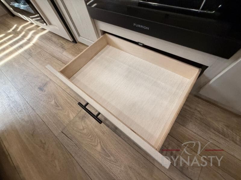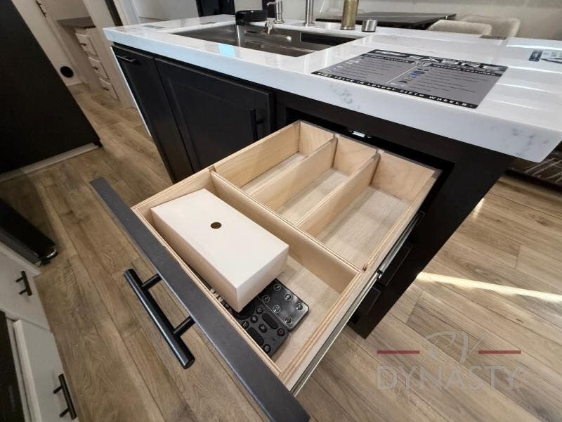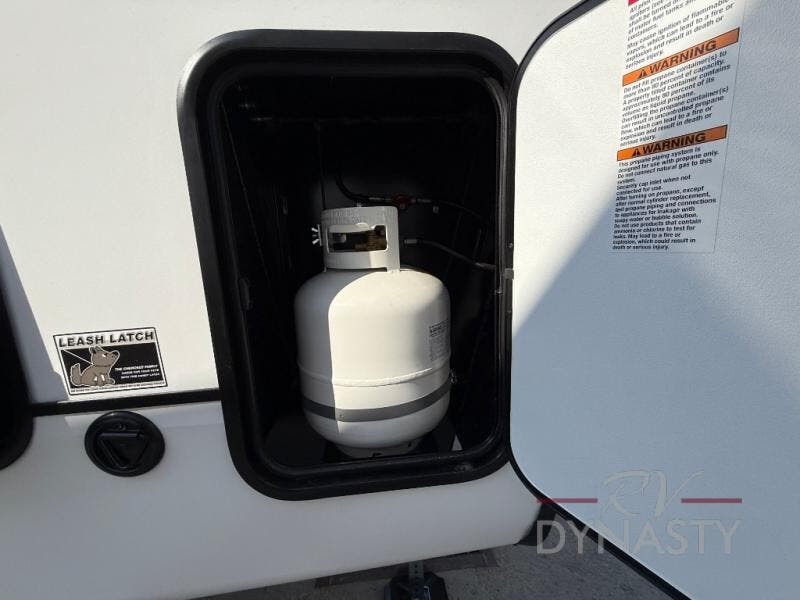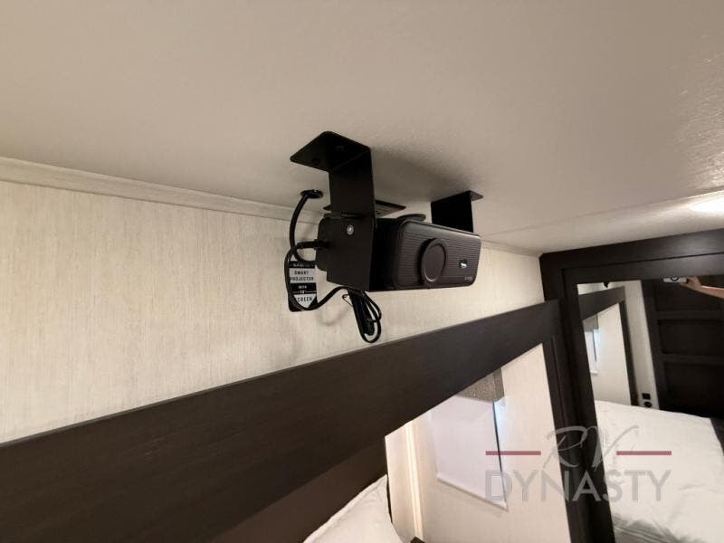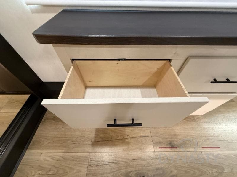 There is much to love in this fifth wheel! Starting with the second bedroom which has a slide that houses a flip-up bunk above a tri-fold sofa across from a desk with drawers, a drop zone, and a wardrobe, plus above all of that is a storage/bunk loft. The rear living area includes a tri-fold sofa, a TV with a hidden pantry behind, and theater seating for two making this space another area at night for guests. In the morning, you can prepare breakfast on the kitchen island, then dine together at the versatile dinette/desk. The full bath will allow you to stay clean throughout your trip, and you'll feel right at home in the front private bedroom with a camper king bed, a dresser, and front wardrobe. Outside, a kitchen and two power awnings create an inviting space!