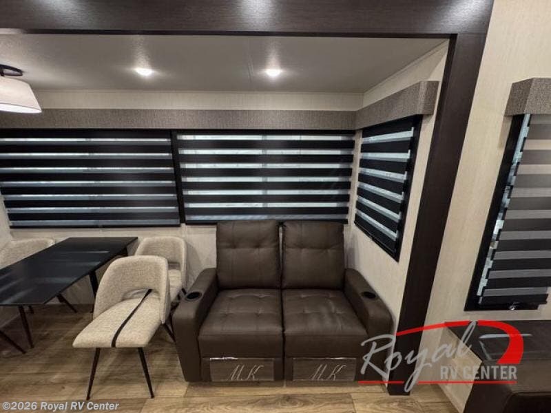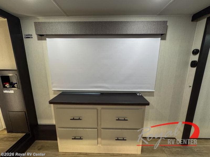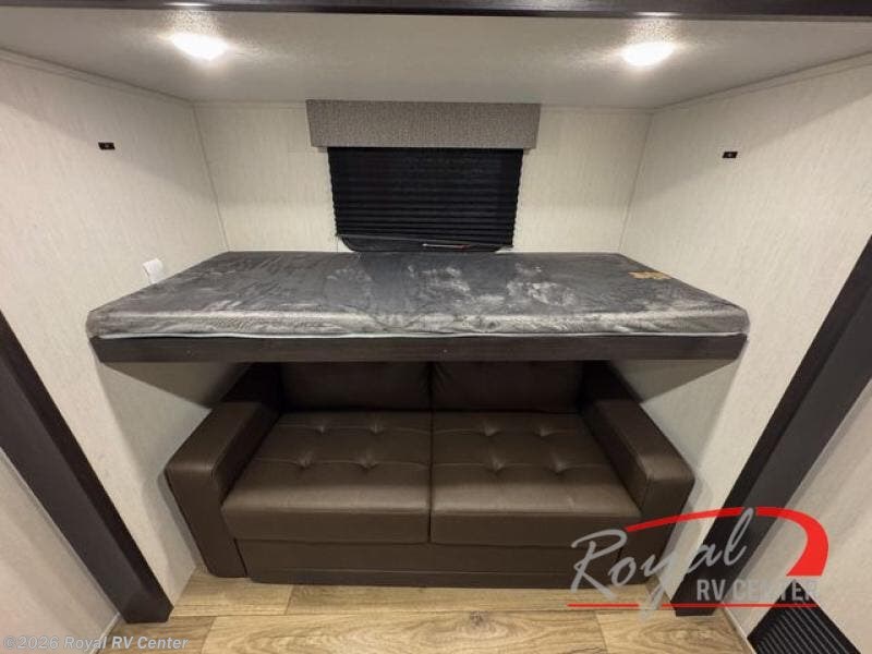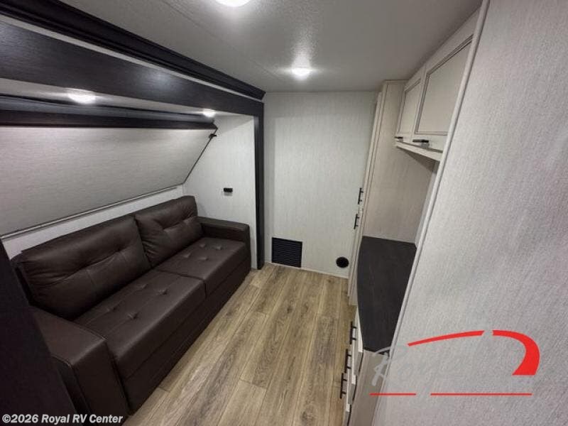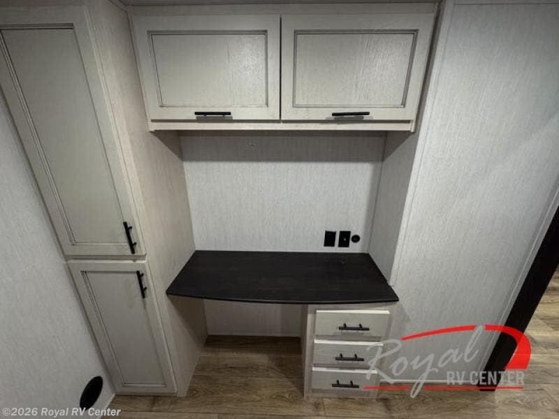 There is much to love in this fifth wheel! Starting with the second bedroom which has a slide that houses a flip-up bunk above a tri-fold sofa across from a desk with drawers, a drop zone, and a wardrobe, plus above all of that is a storage/bunk loft. The rear living area includes a tri-fold sofa, a TV with a hidden pantry behind, and theater seating for two making this space another area at night for guests. In the morning, you can prepare breakfast on the kitchen island, then dine together at the versatile dinette/desk. The full bath will allow you to stay clean throughout your trip, and you'll feel right at home in the front private bedroom with a camper king bed, a dresser, and front wardrobe. Outside, a kitchen and two power awnings create an inviting space!