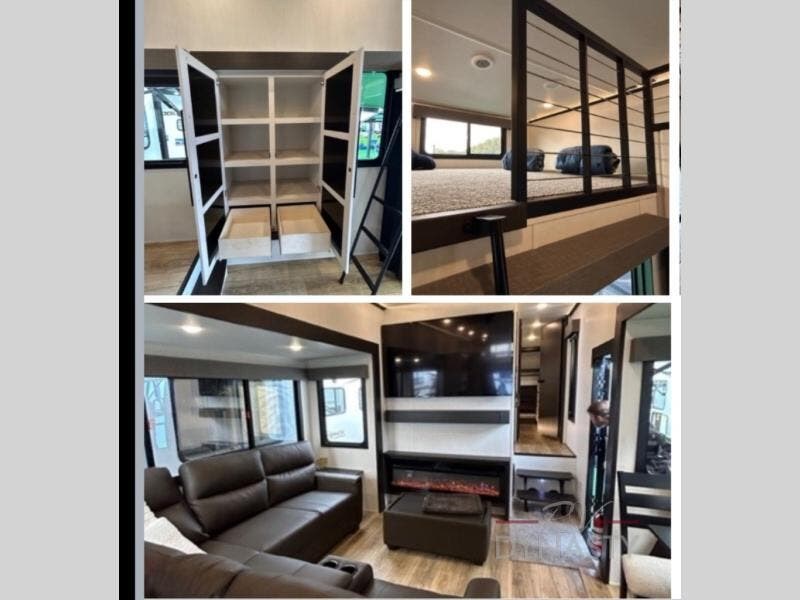 Whether you're weekend warriors or going full-time, this fifth wheel is sure to bring many happy days! The rear deck provides a place to relax in the evenings, and there is an overhead loft above here to use as storage or sleeping space. Once you head through the sliding patio doors, you can make dinner in the full kitchen before relaxing in the middle living room on the sectional sofa. There is also a versatile dinette/desk if game night is in order! The full bath includes a spacious shower with a seat for added comfort, and the camper king bed slide out in the bedroom will give you plenty of space to stretch out at night. You'll also appreciate the dresser and wardrobe to keep your space tidy, plus there is washer and dryer prep if you want to add those appliances!