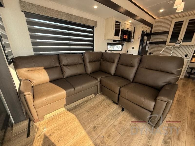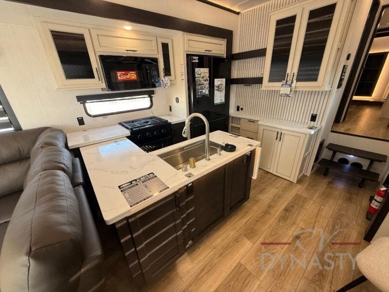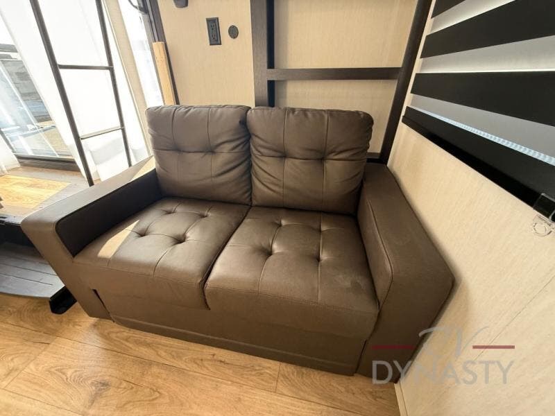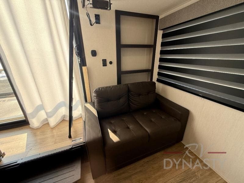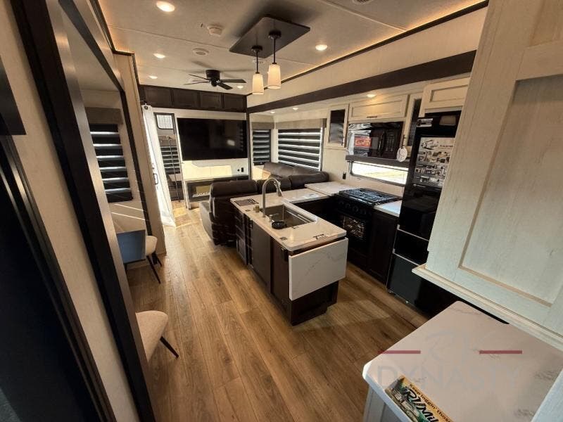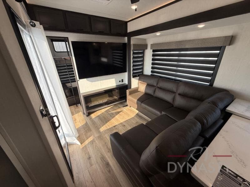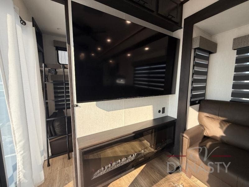 This is the perfect fifth wheel if you enjoy camping with friends and family! You'll have the front private bedroom with a camper king bed slide all to yourselves, while your guests take the rear den. There is a tri-fold sofa here, along with a wardrobe with a desk, additional shelves plus a loft above this room for even more sleeping or storage space! The main living room features an L-shaped sectional sofa, a fireplace and an entertainment center. And the patio deck with a 12' awning is right off of this room so you can visit with friends indoors or outdoors! There is generous counter space in the full kitchen, along with a pull-out storage drawer and a versatile dinette/desk. There are many more stand-out features found in this fifth wheel, including washer and dryer prep in the front bedroom, a 70" projector screen in the rear den, a second power awning, and the list goes on!