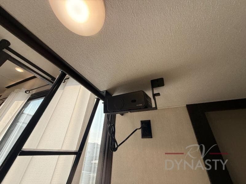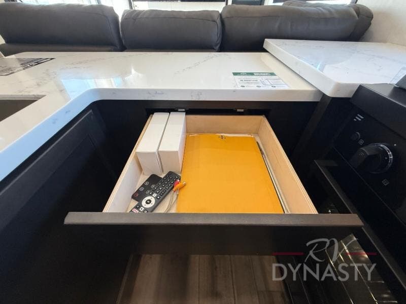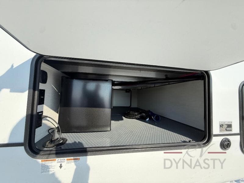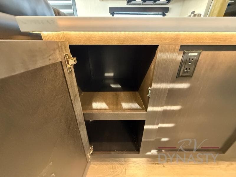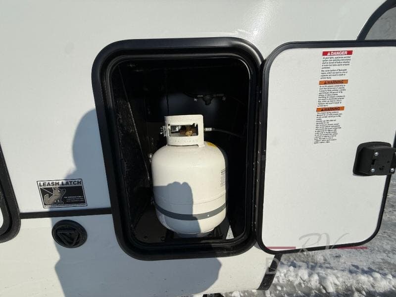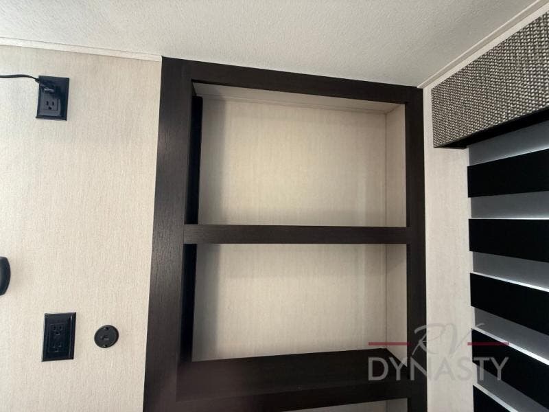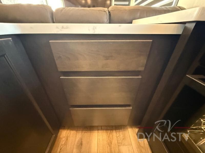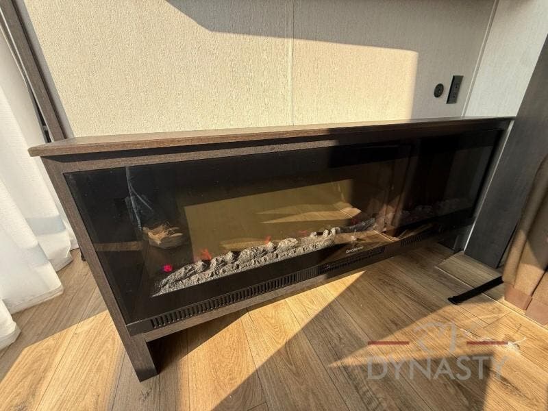 This is the perfect fifth wheel if you enjoy camping with friends and family! You'll have the front private bedroom with a camper king bed slide all to yourselves, while your guests take the rear den. There is a tri-fold sofa here, along with a wardrobe with a desk, additional shelves plus a loft above this room for even more sleeping or storage space! The main living room features an L-shaped sectional sofa, a fireplace and an entertainment center. And the patio deck with a 12' awning is right off of this room so you can visit with friends indoors or outdoors! There is generous counter space in the full kitchen, along with a pull-out storage drawer and a versatile dinette/desk. There are many more stand-out features found in this fifth wheel, including washer and dryer prep in the front bedroom, a 70" projector screen in the rear den, a second power awning, and the list goes on!