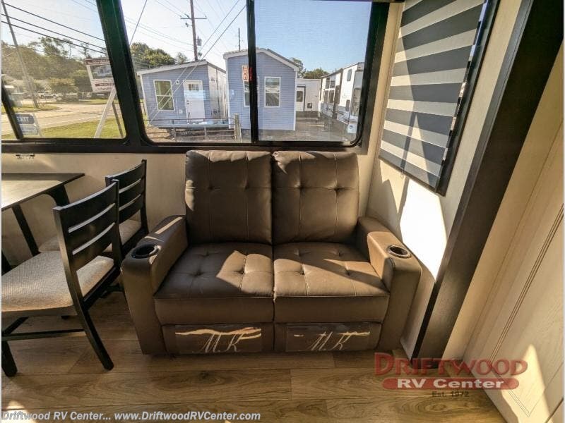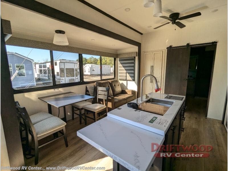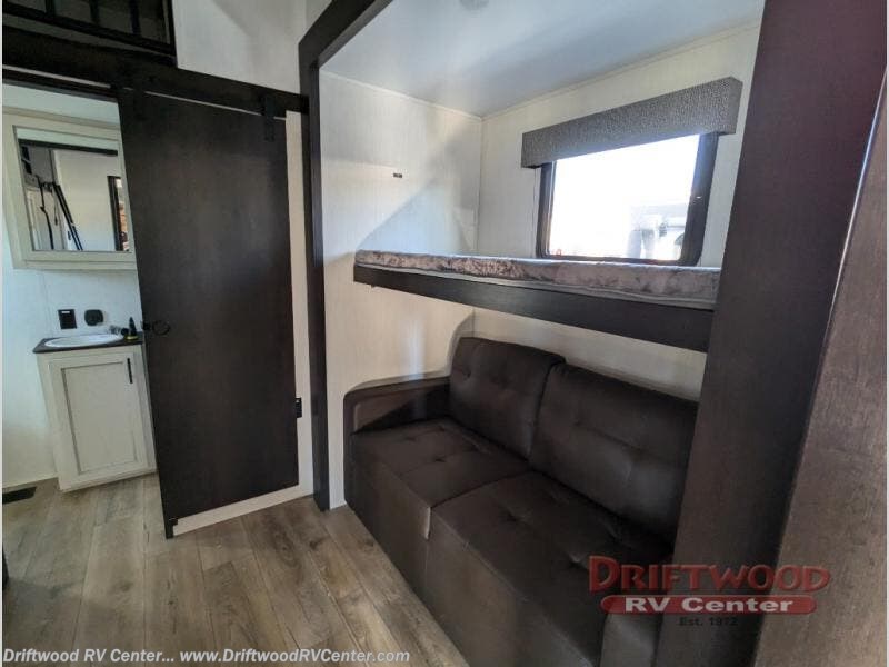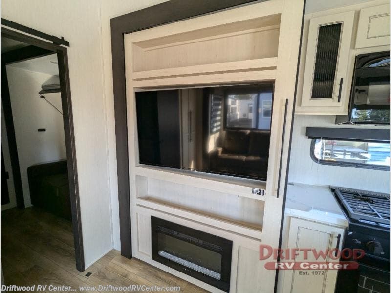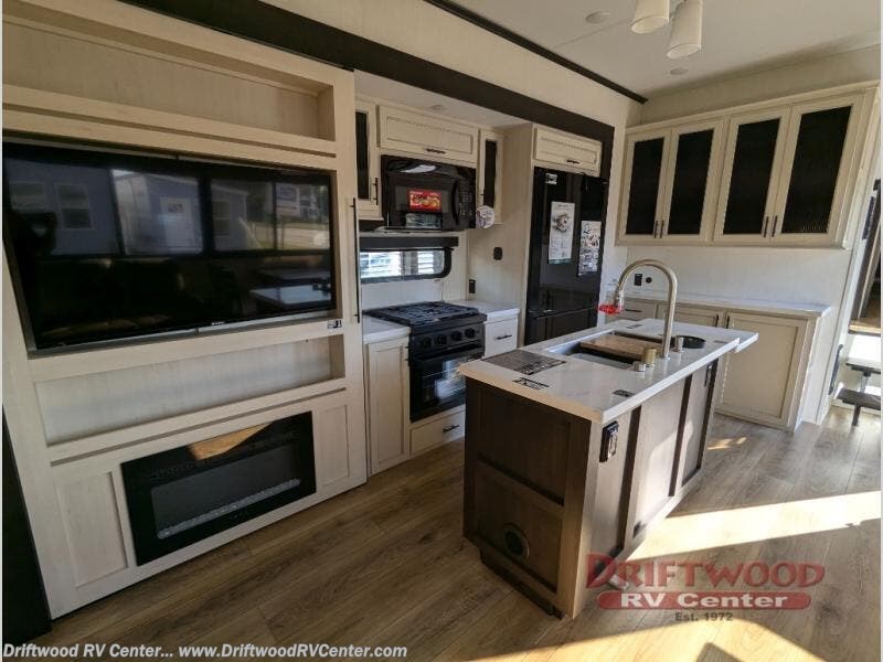 You won't believe all that this fifth wheel has to offer! Enjoy a good night's rest each night on the camper king bed slide in the front private bedroom which also has a front wardrobe with washer and dryer prep, and the rest of your group can sleep in the second bedroom. Inside this bedroom is a slide that houses a tri-fold sofa with a flip-up bunk above it, an entertainment center with storage, and a loft area above it all with two bunks and cabinets. The rear bedroom even has its very own rear full bathroom with a 36" x 24" shower to freshen up in each morning and one of the dual entry doors to the unit. The chef will enjoy using the kitchen island to prepare their best home cooked meals and everyone can gather together at the versatile dinette/desk conveniently across from the entertainment center with a fireplace.