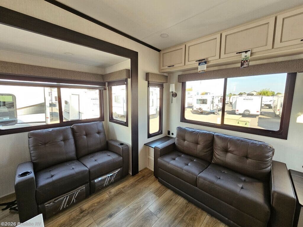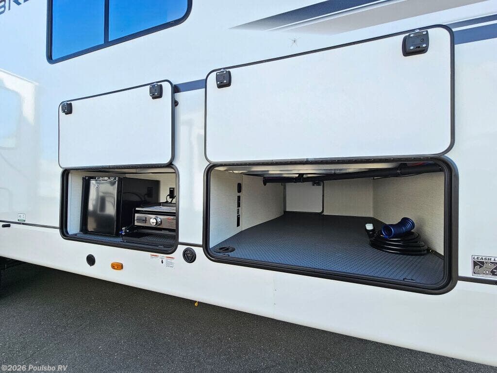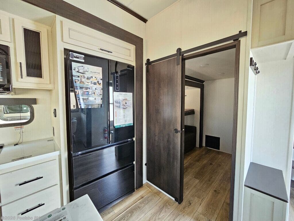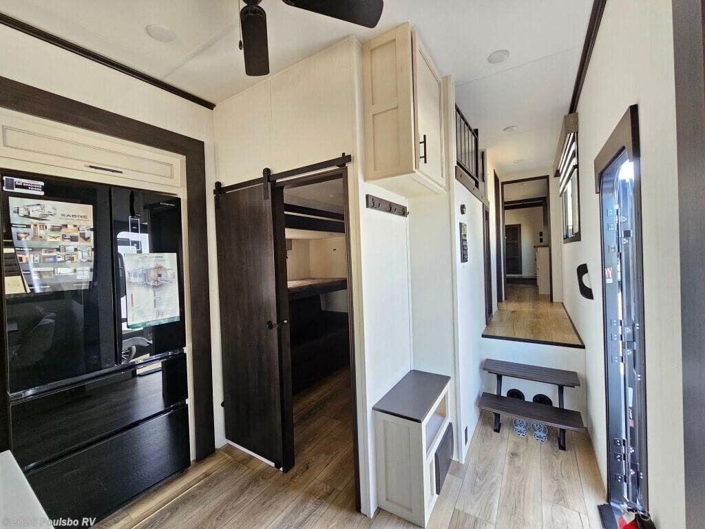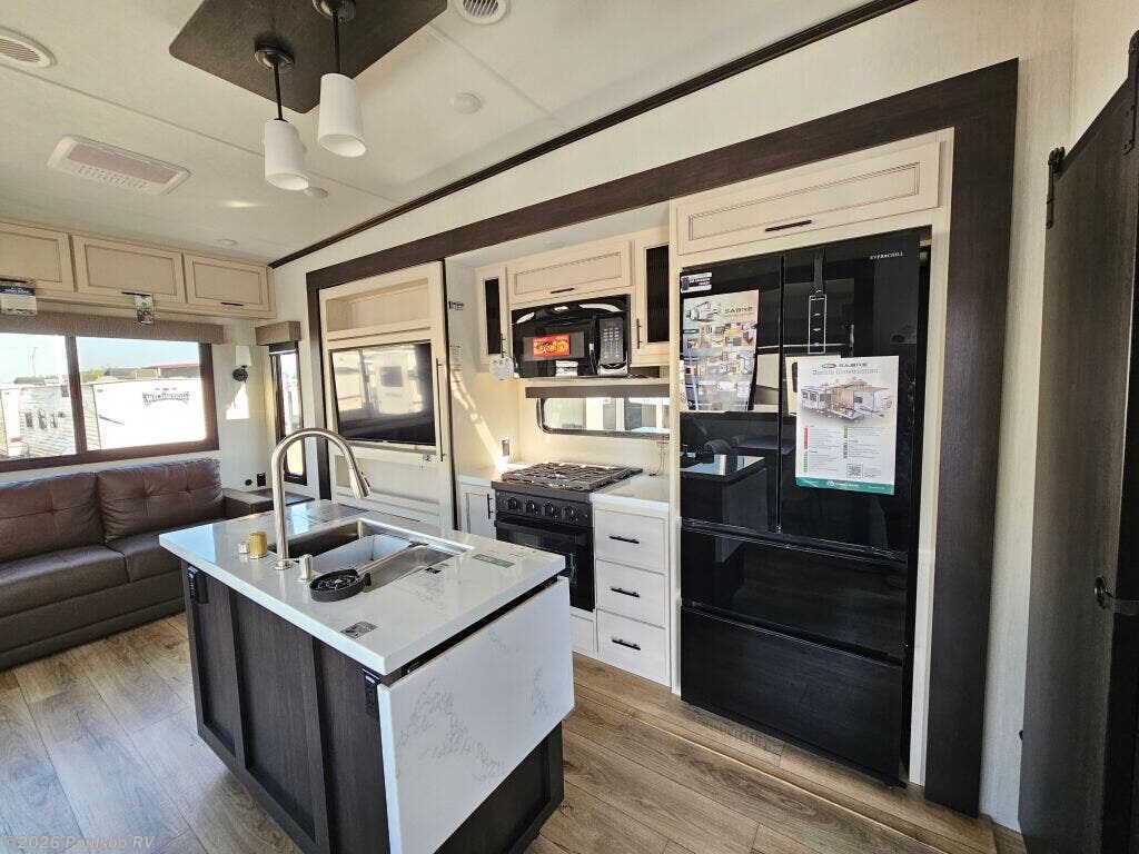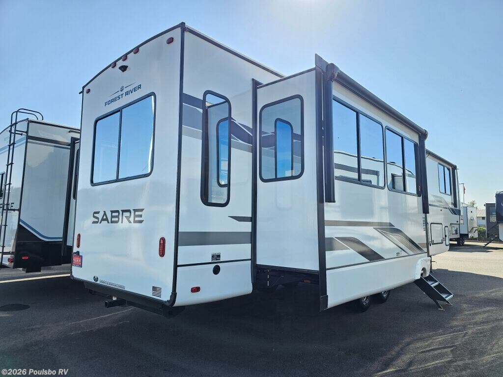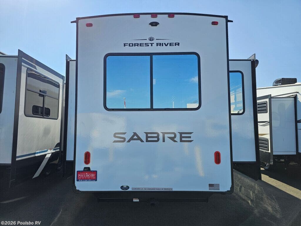 Introducing the 2026 Forest River Sabre 23FLX, a versatile and spacious fifth wheel that is perfect for families and adventurers looking for an exceptional RVing experience. This newly designed model measures an impressive 41 feet in length, making it comfortable for extended trips and accommodating up to 9 guests with ease. It features three slide-outs that enhance its living space, providing ample room to relax and enjoy your time on the road. The Sabre 23FLX is built with convenience and comfort in mind, ensuring that you have everything you need for a memorable journey. The dry weight of 12,503 pounds and a hitch weight of 2,350 pounds assist with stable towing. The RV includes a single awning that provides shade and protection from the elements, allowing you to enjoy outdoor spaces more effectively. Inside, you will find well-appointed living areas, a fully equipped kitchen for meal preparations, and cozy sleeping accommodations that cater to your family's needs. This RV is ready for all of your adventures, whether they are weekend getaways or cross-country trips. As a family-owned, award-winning local RV dealer with multiple locations in Sumner, Everett, Kent, and Mt. Vernon Washington, Poulsbo RV is here to help you find the perfect RV. Stock#: M3705, VIN: 5ZT3SR1B3T6116787.