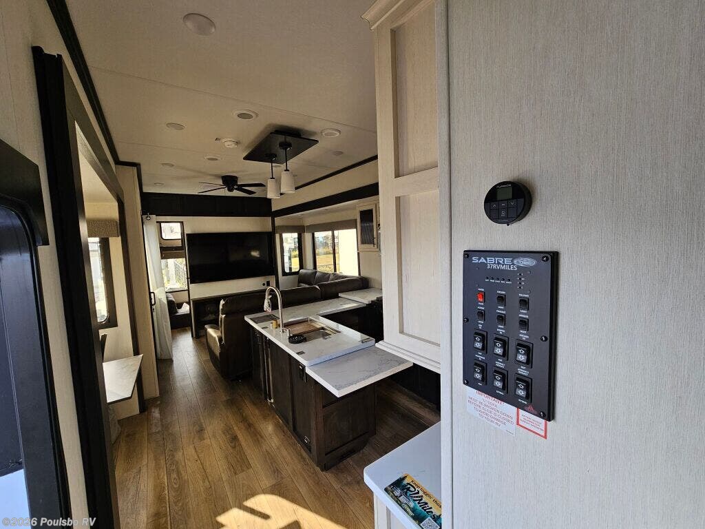 The 2026 Forest River Sabre 37RVMILES offers a spacious and versatile home on wheels designed for the ultimate RV adventure. This new model features an impressive length of nearly 43 feet and four slide outs that dramatically expand the living area, providing abundant space for relaxation and entertainment. With the ability to sleep up to eight people comfortably, it is perfect for families or groups seeking comfort and convenience on the road. The interior is thoughtfully designed to maximize space and flexibility, creating a welcoming environment where everyone can unwind after a day of exploring. Two awnings enhance your outdoor experience, giving you shaded areas to enjoy fresh air and scenic views while protecting you from the sun. Convenience features include easy leveling jacks that simplify setup at any campsite, allowing you to settle in quickly and focus on your adventure. The robust dry weight supports a sturdy hitch weight to ensure a secure and stable towing experience. Forest River Sabre's commitment to quality and thoughtful amenities makes it an excellent choice for those who value space, comfort, and practicality. As a family-owned, award-winning local RV dealer with multiple locations in Sumner, Everett, Kent, and Mt. Vernon Washington, Poulsbo RV here to help you find the perfect RV. Stock#: M3724, VIN: 5ZT3SR2B3T6117081.