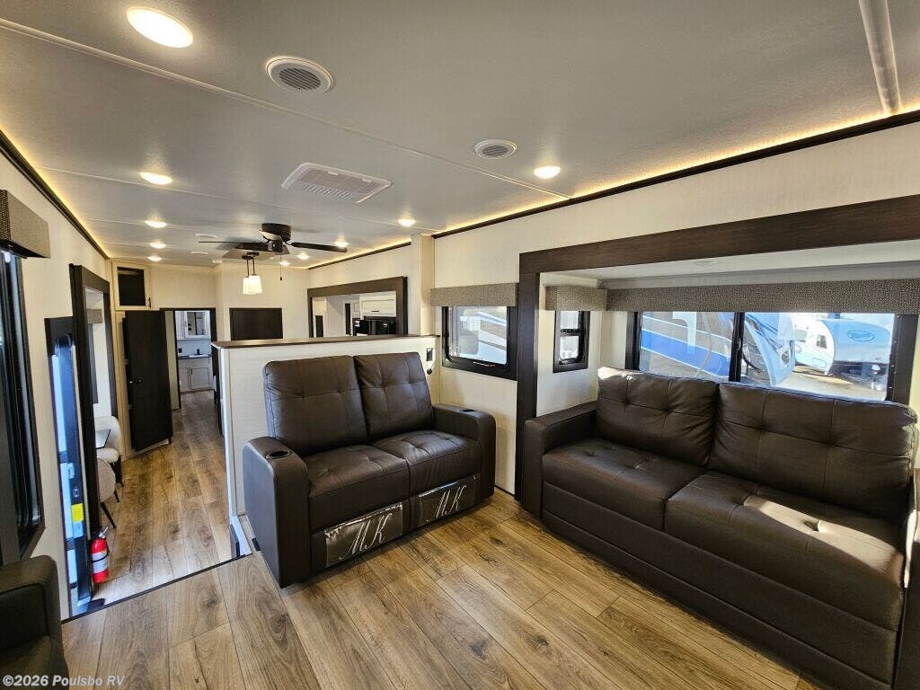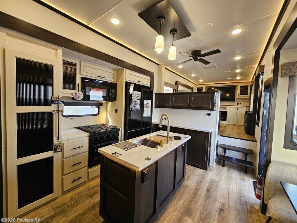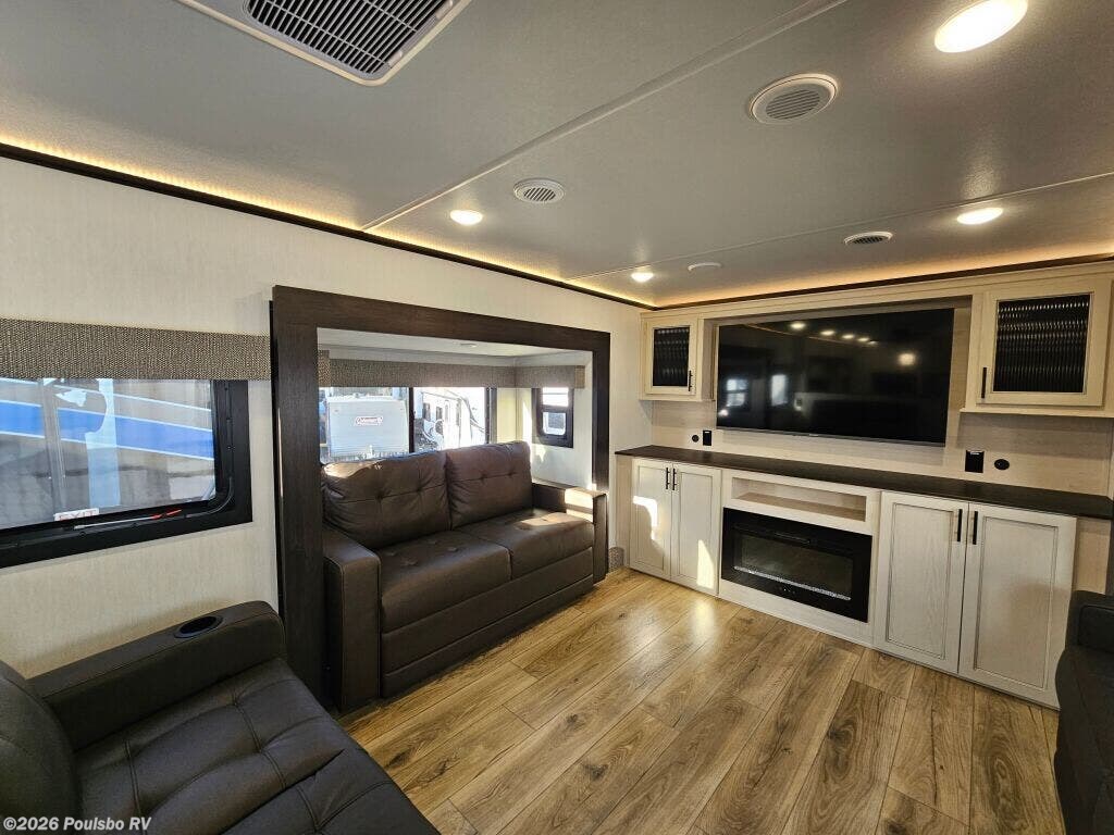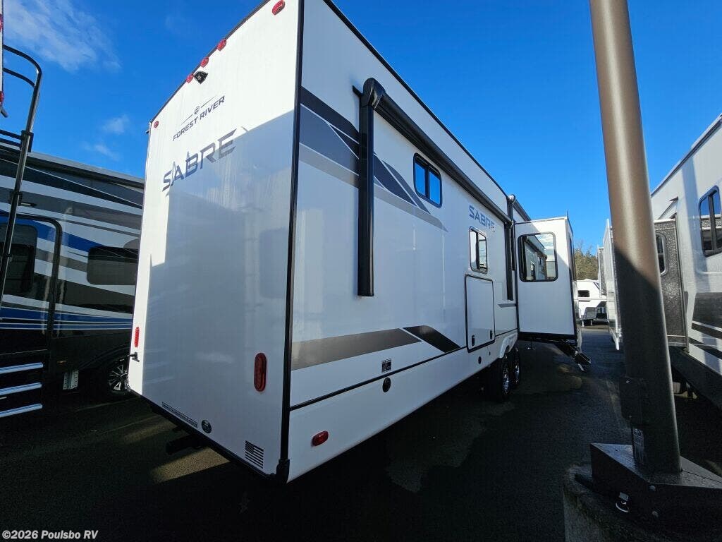 2026 Forest River Sabre 37FLH redefines spacious travel with its expertly designed 42.4 foot length perfect for extended RV adventures. As a new model crafted to combine style and comfort, this RV offers a versatile living area enhanced by five slide outs, significantly expanding your indoor space for effortless entertaining and relaxation. The open floorplan invites natural light and accessibility, making every moment on the road enjoyable while providing ample room to unwind and recharge. With no bunkhouse configuration, the layout focuses on flexible and comfortable sleeping accommodations tailored to your travel needs. The power leveling jacks at front and rear ensure setup is quick and stable, optimizing ease of use wherever your travels take you. Dry weight of 12,503 pounds and a hitch weight of 2,515 pounds balance the ride and towing demands, making mobility smooth and manageable. This model includes thoughtful features aimed at convenience and enjoyment in every journey. Embrace the freedom of the outdoors with the reliability and functionality that come standard in this Forest River model. As a family-owned, award-winning local RV dealer with multiple locations in Sumner, Everett, Kent, and Mt. Vernon Washington, Poulsbo RV here to help you find the perfect RV. Stock#: S975, VIN: 5ZT3SR2B6T6117883.