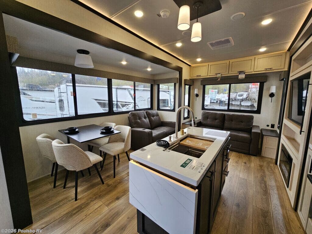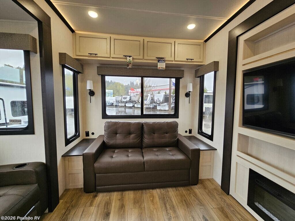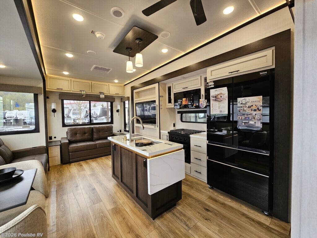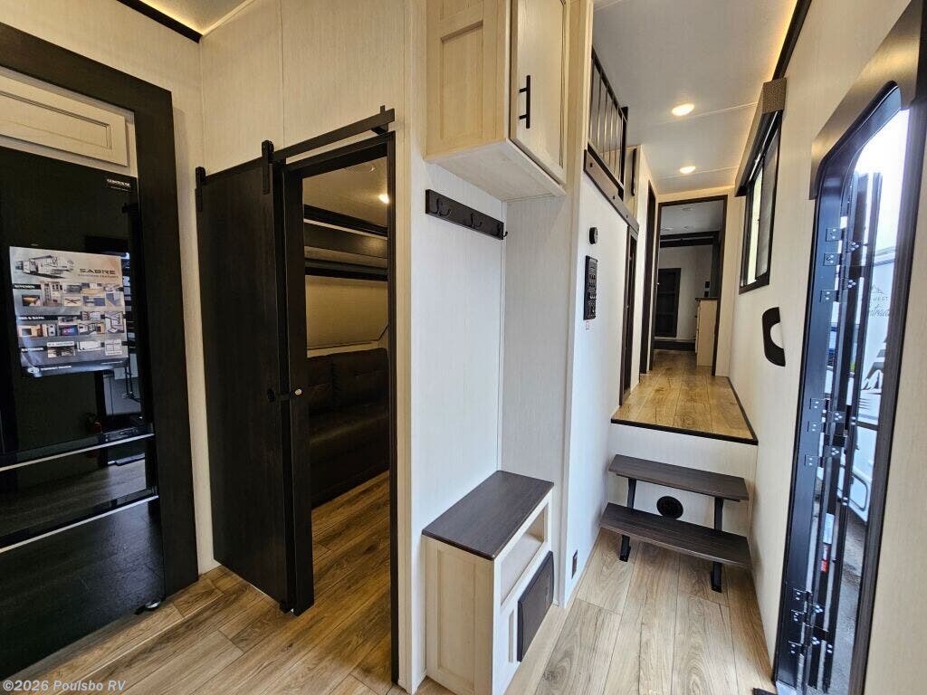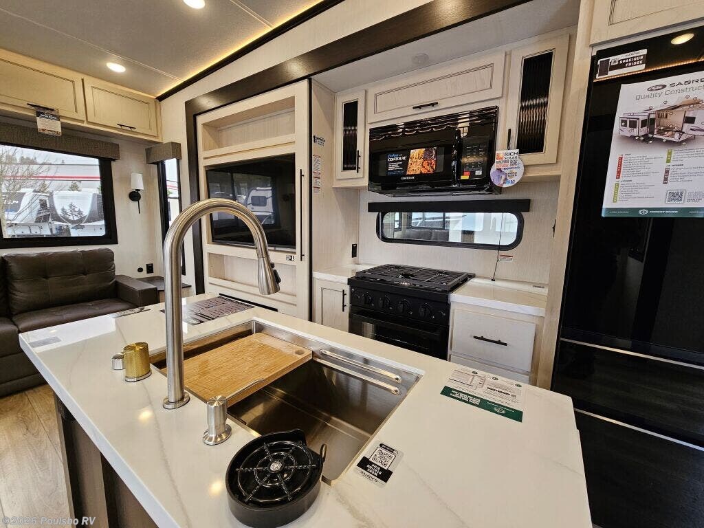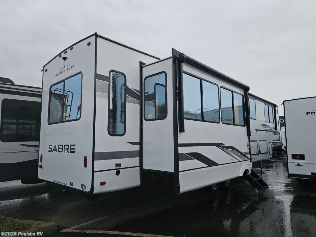 The 2026 Forest River Sabre 36FLX is a new and spacious travel trailer built to elevate your RV lifestyle with room to accommodate families or groups of up to nine people comfortably. Boasting an overall length of 41 feet, this model offers ample living space and versatile sleeping options, including a dedicated bunkhouse that ensures everyone traveling with you has a private and restful place to sleep. Designed for those who enjoy extended outdoor living, the Sabre 36FLX is equipped with two awnings that create ideal shaded areas for relaxing outside or entertaining guests. Its convenient leveling jacks provide effortless setup and stability on various terrain, allowing you to focus on enjoying your journey. The interior living area has been carefully designed to promote relaxation and convenience, with plenty of space to gather with loved ones or unwind after a day of adventure. With a dry weight of 12,503 pounds and a hitch weight of 2,350 pounds, this travel trailer offers a manageable towing experience. Whether you are setting out for a weekend trip or a longer excursion, this Forest River Sabre provides a harmonious balance of comfort, function, and style to enhance your travel experience. As a family-owned, award-winning local RV dealer with multiple locations in Sumner, Everett, Kent, and Mt. Vernon Washington, Poulsbo RV is here to help you find the perfect RV. Stock#: S1017, VIN: 5ZT3SR1BXT6118116.