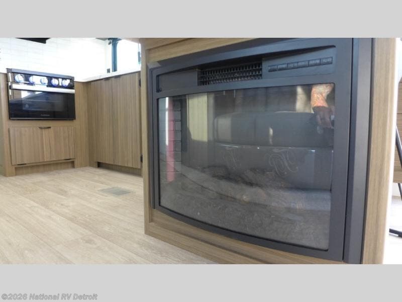 You can enjoy at-home comforts wherever you decide to camp in this travel trailer. The custom king bed with Versa Tilt includes dual shelves and a wardrobe so you can keep your space tidy. If you have a guest or two little ones, they can sleep on the jackknife sofa within the large slide out. Once you've made breakfast in the fully equipped kitchen, you can utilize the pull-out table to dine at. There is also a fireplace below the table, which will be perfect for cozy evenings indoors. And don't overlook the full rear bath, complete with a spacious shower, a toilet, bath shelves, and ample counter space!