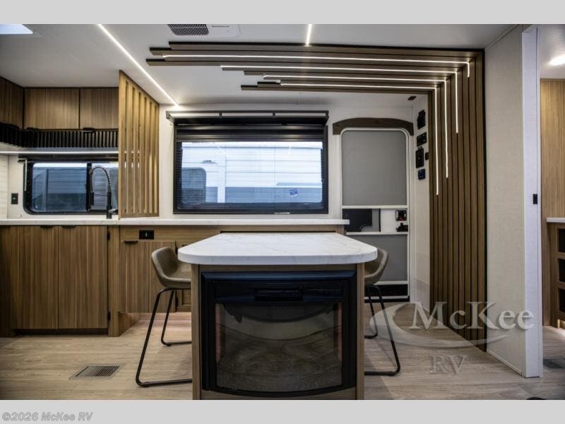 You can enjoy at-home comforts wherever you decide to camp in this travel trailer. The custom king bed with Versa Tilt includes dual shelves and a wardrobe so you can keep your space tidy. If you have a guest or two little ones, they can sleep on the jackknife sofa within the large slide out. Once you've made breakfast in the fully equipped kitchen, you can utilize the pull-out table to dine at. There is also a fireplace below the table, which will be perfect for cozy evenings indoors. And don't overlook the full rear bath, complete with a spacious shower, a toilet, bath shelves, and ample counter space!