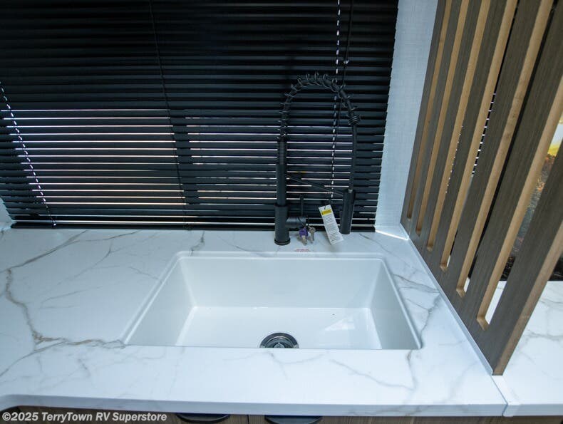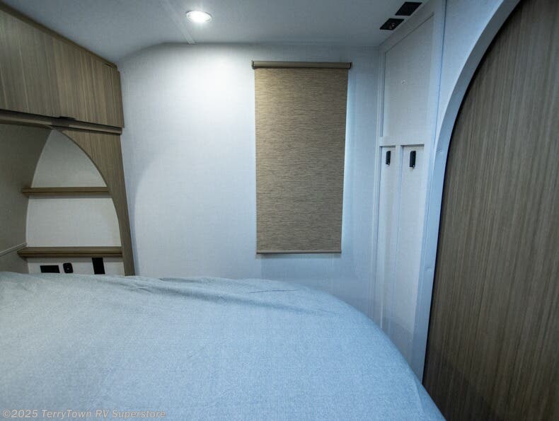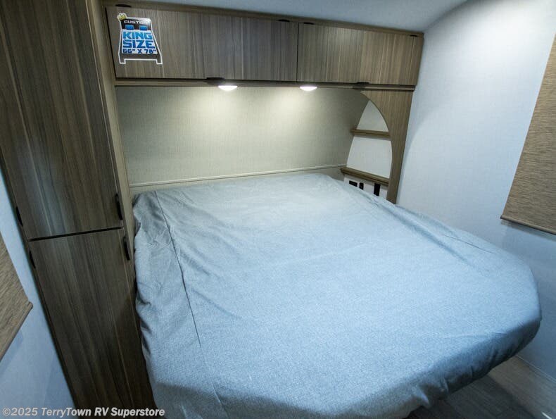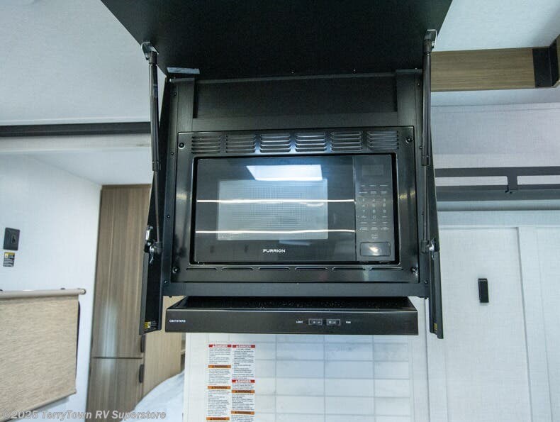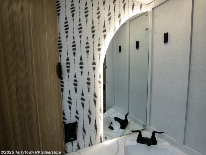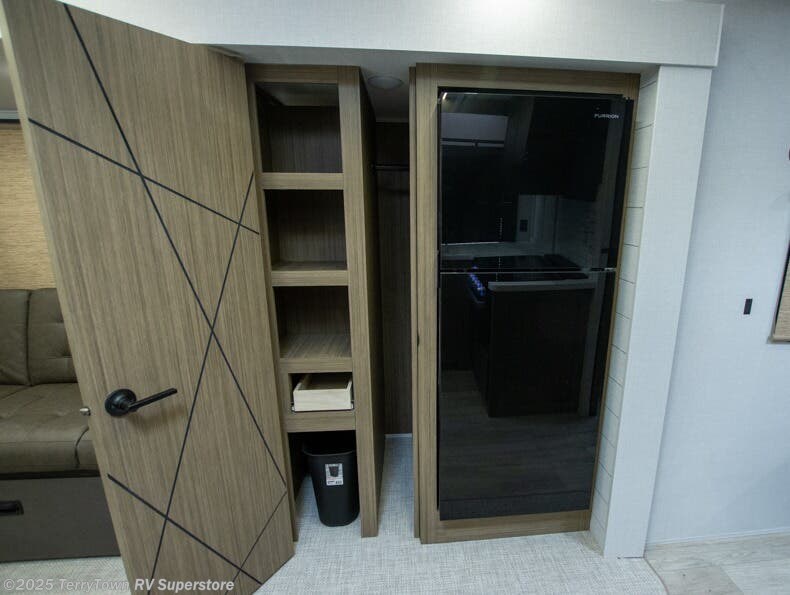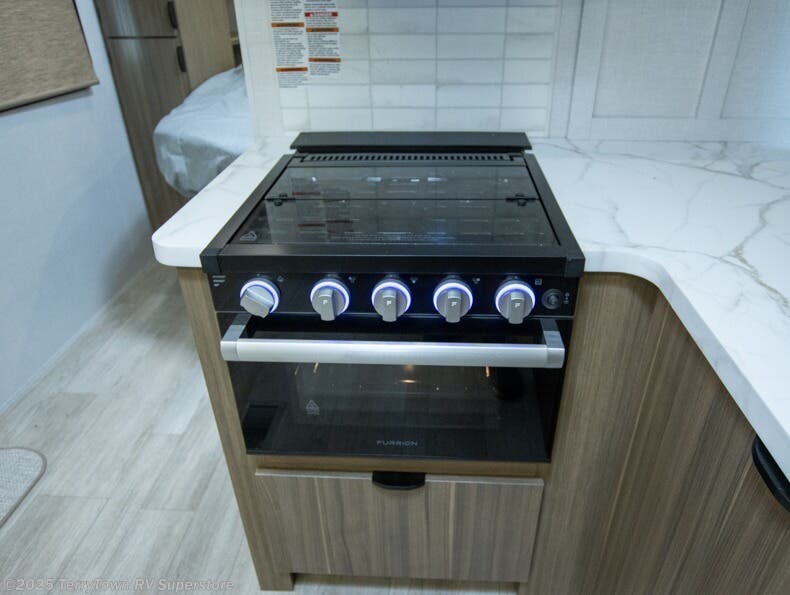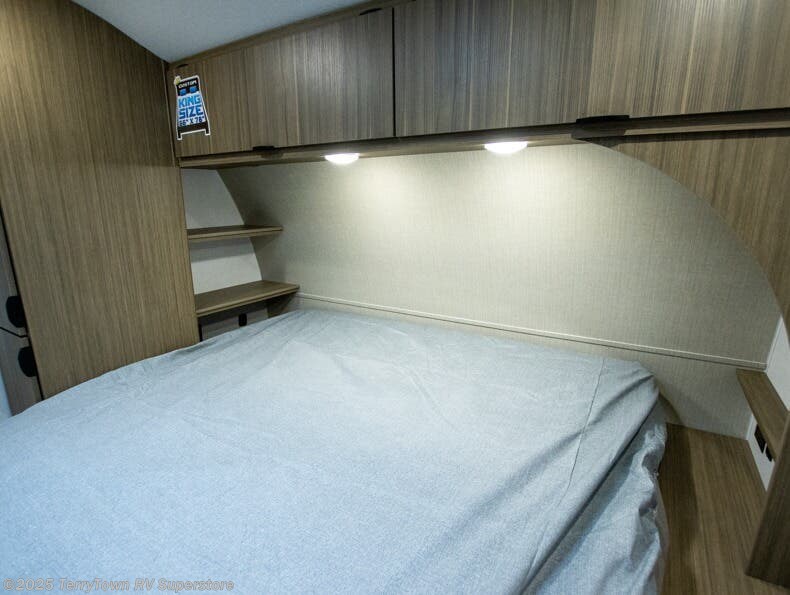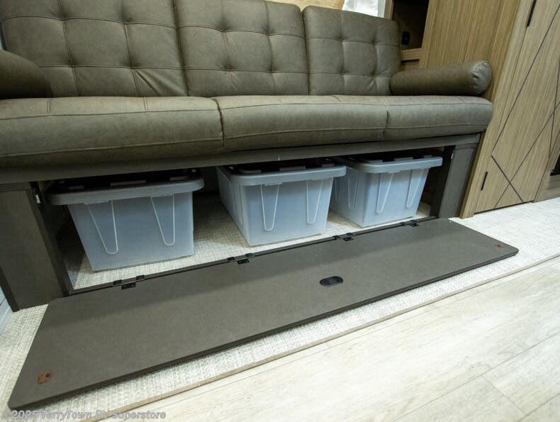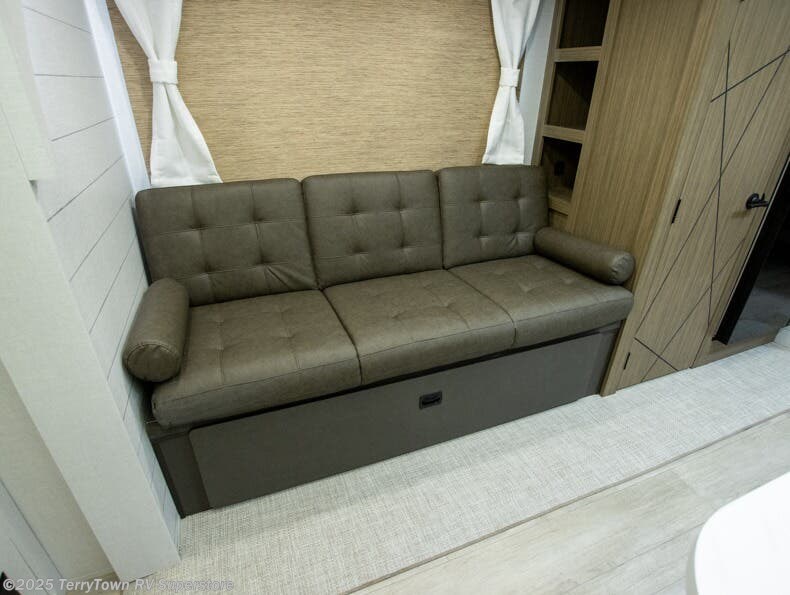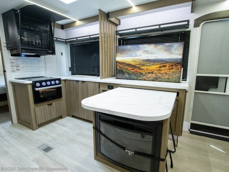 You can enjoy at-home comforts wherever you decide to camp in this travel trailer. The custom king bed with Versa Tilt includes dual shelves and a wardrobe so you can keep your space tidy. If you have a guest or two little ones, they can sleep on the jackknife sofa within the large slide out or on the double-size bunks right next to the full bath. Once you've made breakfast in the fully equipped kitchen, you can utilize the pull-out table to dine at. There is also a fireplace below the table, which will be perfect for cozy evenings indoors.