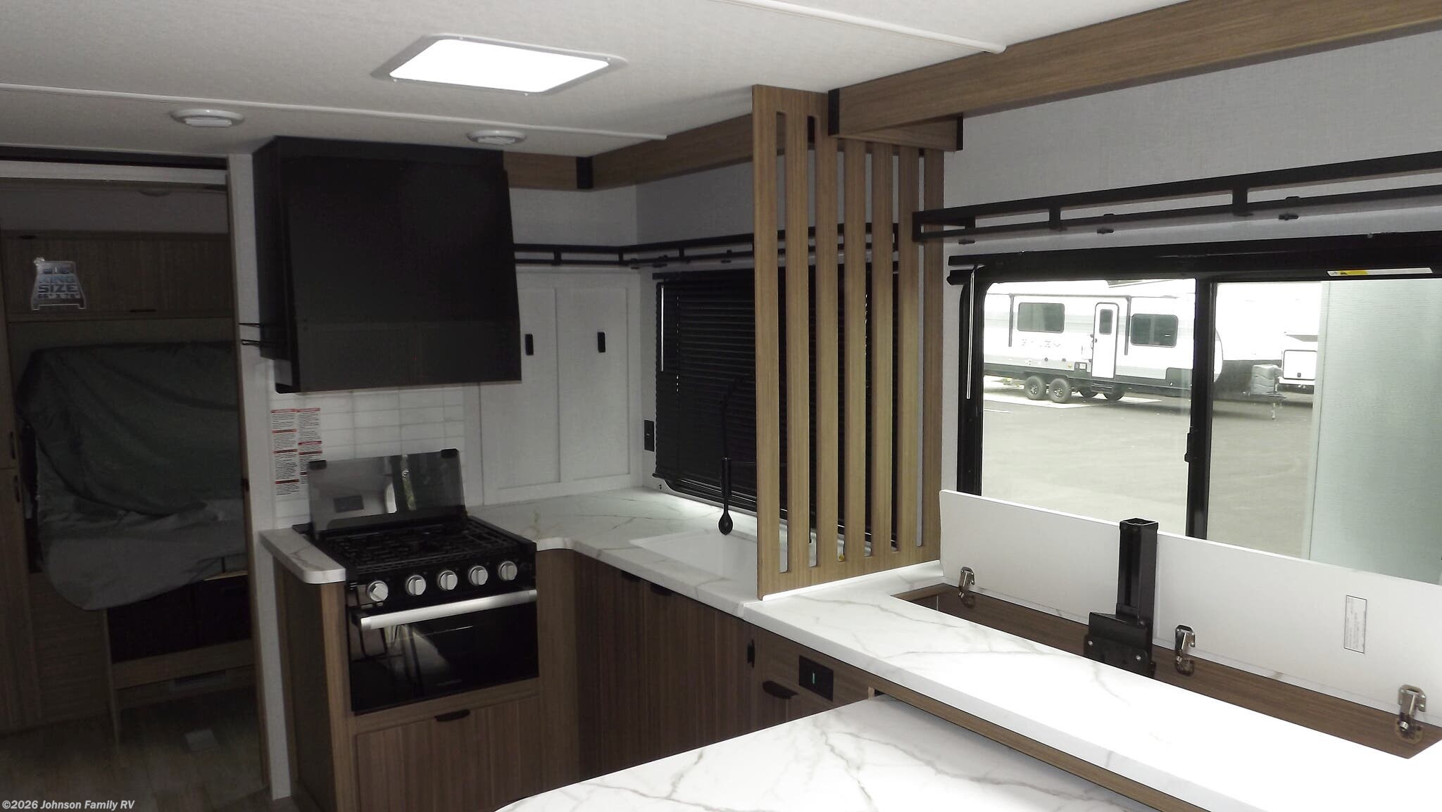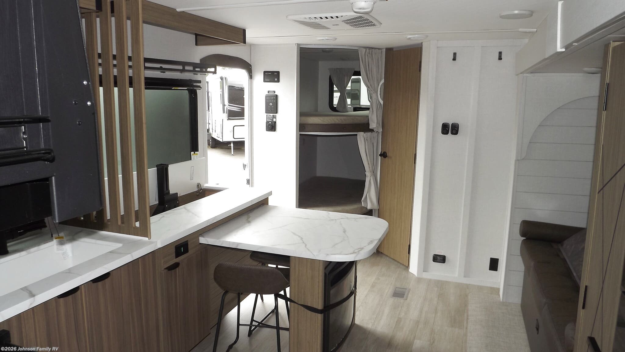 The 260ICE floorplan thoughtfully arranges bunk beds, a front bedroom, a mid kitchen, a mid living area, an outdoor kitchen, and a rear bath. A single slideout enhances the living space, creating a roomy feel in the central living and dining zone. The bunk bed setup is perfect for kids or additional guests, while the front bedroom offers a private retreat after a day of adventures. The inclusion of an outdoor kitchen expands your cooking options and adds outdoor living versatility for sunny days and evenings under the stars.