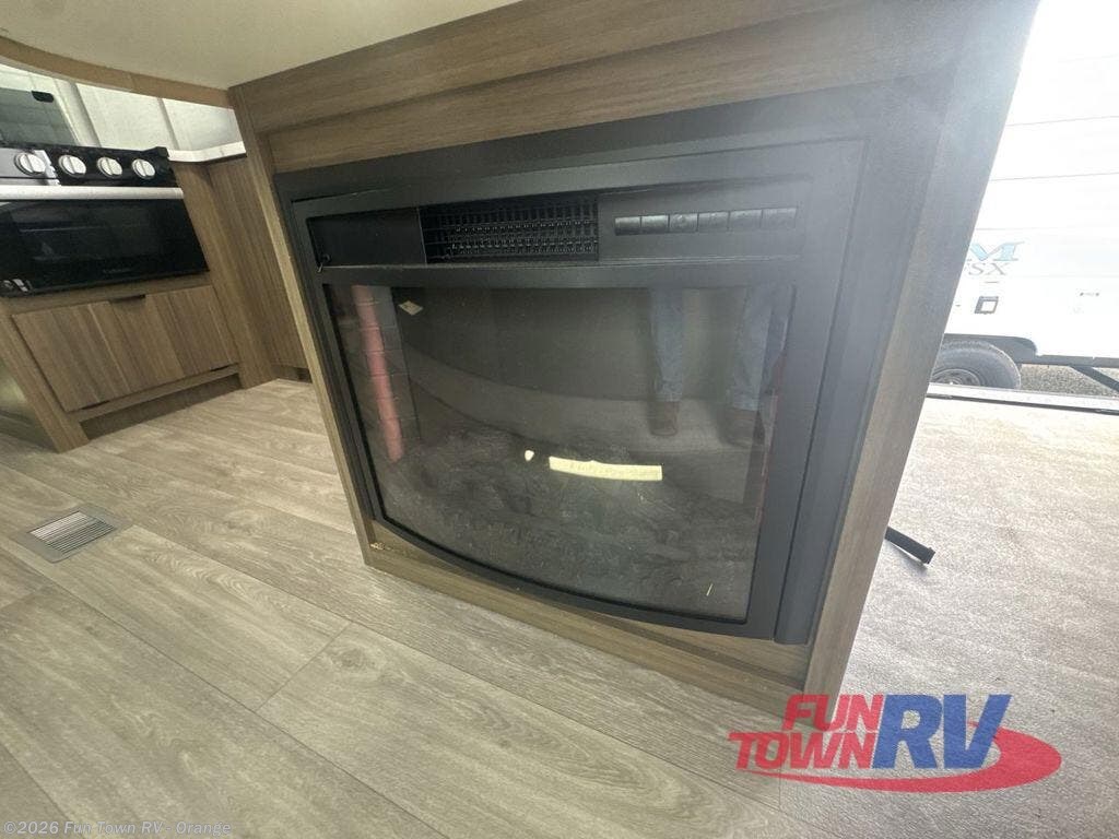 You can enjoy at-home comforts wherever you decide to camp in this travel trailer. The custom king bed with Versa Tilt includes dual shelves and a wardrobe so you can keep your space tidy. If you have a guest or two little ones, they can sleep on the jackknife sofa within the large slide out or on the double-size bunks right next to the full bath. Once you've made breakfast in the fully equipped kitchen, you can utilize the pull-out table to dine at. There is also a fireplace below the table, which will be perfect for cozy evenings indoors.