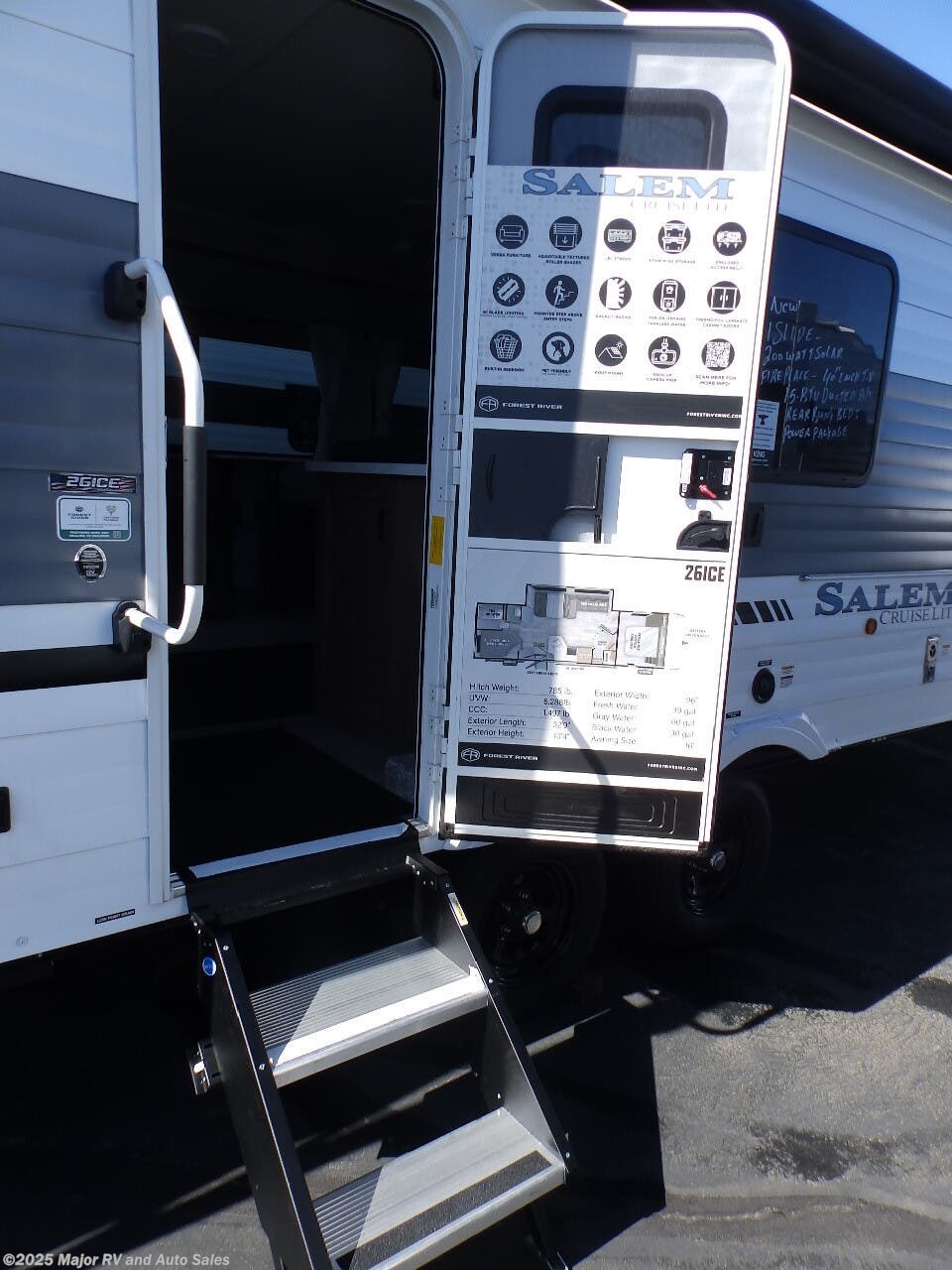WE DO NOT CHARGE FOR PRE-DELIVERY INSPECTION OR PREP FEES LIKE MOST OTHER DEALERS! NEW 2026 FOREST RIVER SALEM 26ICE, REAR BUNK MODEL, FRONT WALK AROUND CUSTOM KING VERSA-TILT BED IN A PRIVATE BEDROOM, 32' 9" FT LONG PULL TRAVEL TRAILER, DRY WEIGHT ONLY 6377 LBS, HALF TON TOWABLE! UPGRADED POWER STABILIZER JACKS IN ALL 4 CORNERS, UPGRADED POWER AWNING WITH LED STRIP, UPGRADED POWER TONGUE JACK, 1 LIVING ROOM SLIDE OUT, ***UPGRADED 200 WATT SOLAR PANEL***, DUAL 5 GALLON PROPANE TANKS, SPARE TIRE, LARGE FULL PASS THRU EXTERIOR STORAGE, EXTERIOR SHOWER, TANKLESS (GAS) LP WATER HEATER, JBL AM/FM/BLUETOOTH PLAYER WITH INTERIOR SPEAKERS, HIDDEN PANTRY BEHIND ENTERTAINMENT CENTER, LARGE 2 DOOR 10 CUBIC FT 12-VOLT REFRIGERATOR/FREEZER, 3 BURNER COOKTOP, MICROWAVE/ CONVECTION OVEN/ AIR FRYER ALL-IN-ONE, VERSA-LOUNGE ADJUSTABLE SOFA/SLEEPER AND DINETTE/SLEEPER, LARGE REAR DUAL BUNK BEDS, FRONT PRIVATE BEDROOM WITH WALK AROUND VERSA-TILT CUSTOM KING BED, COAT CLOSET IN THE BEDROOM, SLEEPS 8, ROLLER SHADES, LIVING ROOM SLIDE OUT WITH DELUXE WOOD TRIM ON INTERIOR SLIDE, PRIVATE BATHROOM WITH PORCELAIN TOILET AND TUB/SHOWER COMBO, SEPARATE LAVY SINK AND VANITY, ***UPGRADED SKYLIGHT OVER THE SHOWER***, ***EXTERIOR FRIDGE AND LP BBQ HOOKUP***, ECLIPSE INTERIOR FABRIC, ***UPGRADED 15,000 BTU DUCTED A/C***, DUCTED HEATER, THIS UNIT IS LOADED! WE DO NOT CHARGE FOR PRE-DELIVERY INSPECTION (PDI), SAFETY INSPECTION, OR WALK THRU. MOST OTHER DEALERS CHARGE ADDITIONAL FEES FOR PDI UP TO $1895 EXTRA), YOU BETTER ASK! (IF YOUR SHOPPING AROUND FOR PRICES, MAKE SURE COMPARE ALL THE EXTRA OPTIONS OUR UNIT HAS TO THEIR UNIT). ANY GOVERNMENT FEES, SALES TAX, REGISTRATION FEE, DEALER, LICENSE FEE, FINANCE CHARGES, ANY DEALER DOCUMENT PREPARATION CHARGE, AND ANY EMISSION TESTING CHARGE, ARE ADDITIONAL TO THE ADVERTISED PRICE.***DON'T SEE THE TRAILER THAT YOU'RE LOOKING FOR? ASK US ABOUT OUR SPECIAL ORDERING PROGRAM FOR THE BRANDS THAT WE CARRY!***