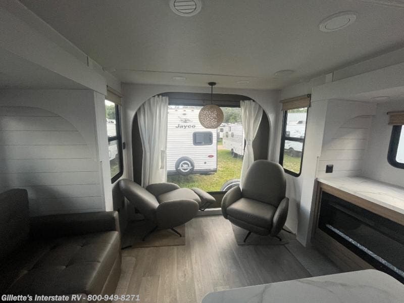 Find your zen int this spacious travel trailer for four! Once you've unloaded your gear, you can head inside to make lunch at the kitchen island with four chairs. An 80" trundle sofa provides additional seating space plus sleeping space for guests. You will love the rear custom recliners that are conveniently located next to the fireplace. The full bath is located towards the front next to the private bedroom so you can easily use the restroom at night, and you're sure to get a great night's rest on the custom king bed with Versa Tilt. This unit also includes washer and dryer prep, giving you the option to add these appliances.
