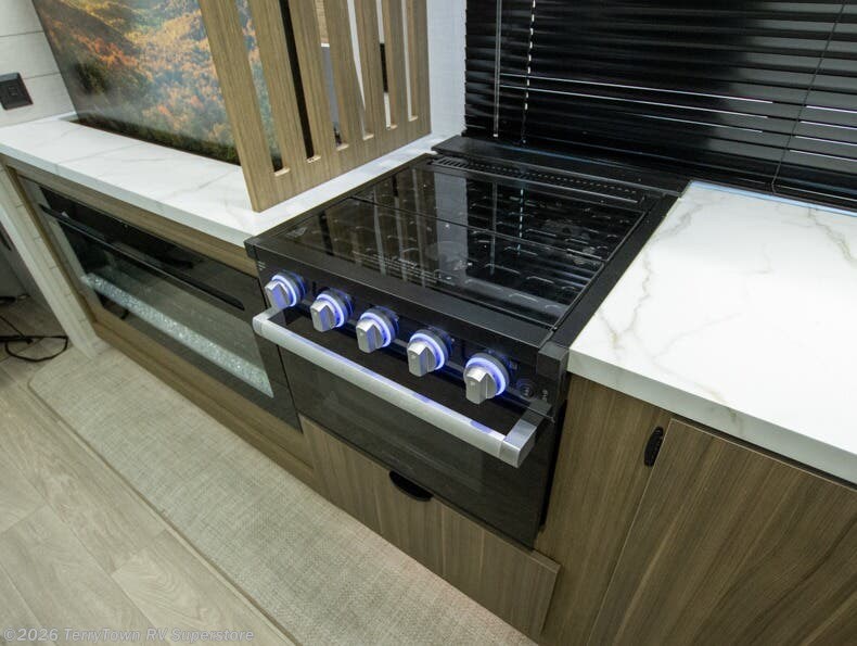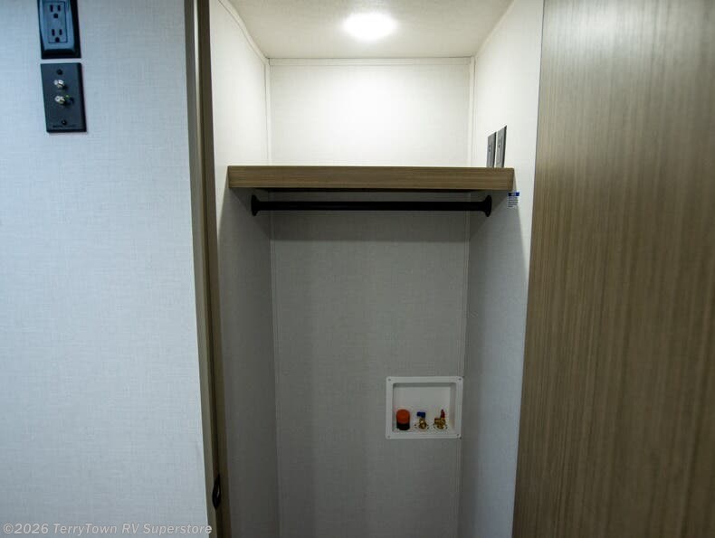 Find your zen int this spacious travel trailer for four! Once you've unloaded your gear, you can head inside to make lunch at the kitchen island with four chairs. An 80" trundle sofa provides additional seating space plus sleeping space for guests. You will love the rear custom recliners that are conveniently located next to the fireplace. The full bath is located towards the front next to the private bedroom so you can easily use the restroom at night, and you're sure to get a great night's rest on the custom king bed with Versa Tilt. This unit also includes washer and dryer prep, giving you the option to add these appliances.