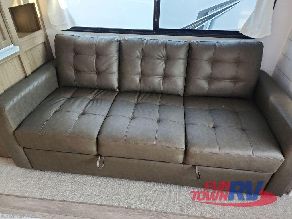 Find your zen int this spacious travel trailer for four! Once you've unloaded your gear, you can head inside to make lunch at the kitchen island with four chairs. An 80" trundle sofa provides additional seating space plus sleeping space for guests. You will love the rear custom recliners that are conveniently located next to the fireplace. The full bath is located towards the front next to the private bedroom so you can easily use the restroom at night, and you're sure to get a great night's rest on the custom king bed with Versa Tilt. This unit also includes washer and dryer prep, giving you the option to add these appliances.