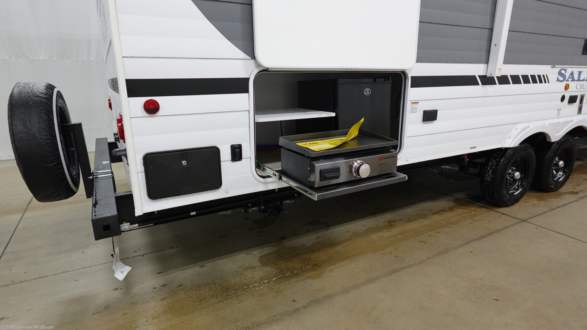 Experience the perfect blend of comfort and adventure with the 2026 Forest River Salem Cruise Lite 273QBXL. This travel trailer is designed to accommodate up to 11 sleepers, making it an ideal choice for families or groups looking to explore the great outdoors without sacrificing luxury. The spacious interior features a versatile king bed and three convertible sleeping options, ensuring everyone has a cozy spot to rest. The bunkhouse at the rear offers a fun and functional space for kids or guests, complete with a Jiffy sofa and fold-up bunk beds. The heart of this RV is its well-appointed center kitchen, equipped with a full-size electric refrigerator and a three-burner cooktop, perfect for preparing meals on the go. The adjacent living area boasts a panoramic window and a Versa Lounge, creating a welcoming space for relaxation or entertaining. Enjoy the convenience of a walk-in shower with a curtain in the center bath. Outside, the 16-foot powered retractable awning and exterior camp kitchen enhance your outdoor living experience, making it easy to enjoy meals and gatherings under the open sky. With a dry weight of 5,975 lbs and a cargo capacity of 1,705 lbs, this trailer is both robust and easy to tow. Whether you're embarking on a weekend getaway or a cross-country adventure, the Salem Cruise Lite 273QBXL is your home away from home. For more details or to see it in person, visit your nearest General RV dealership.