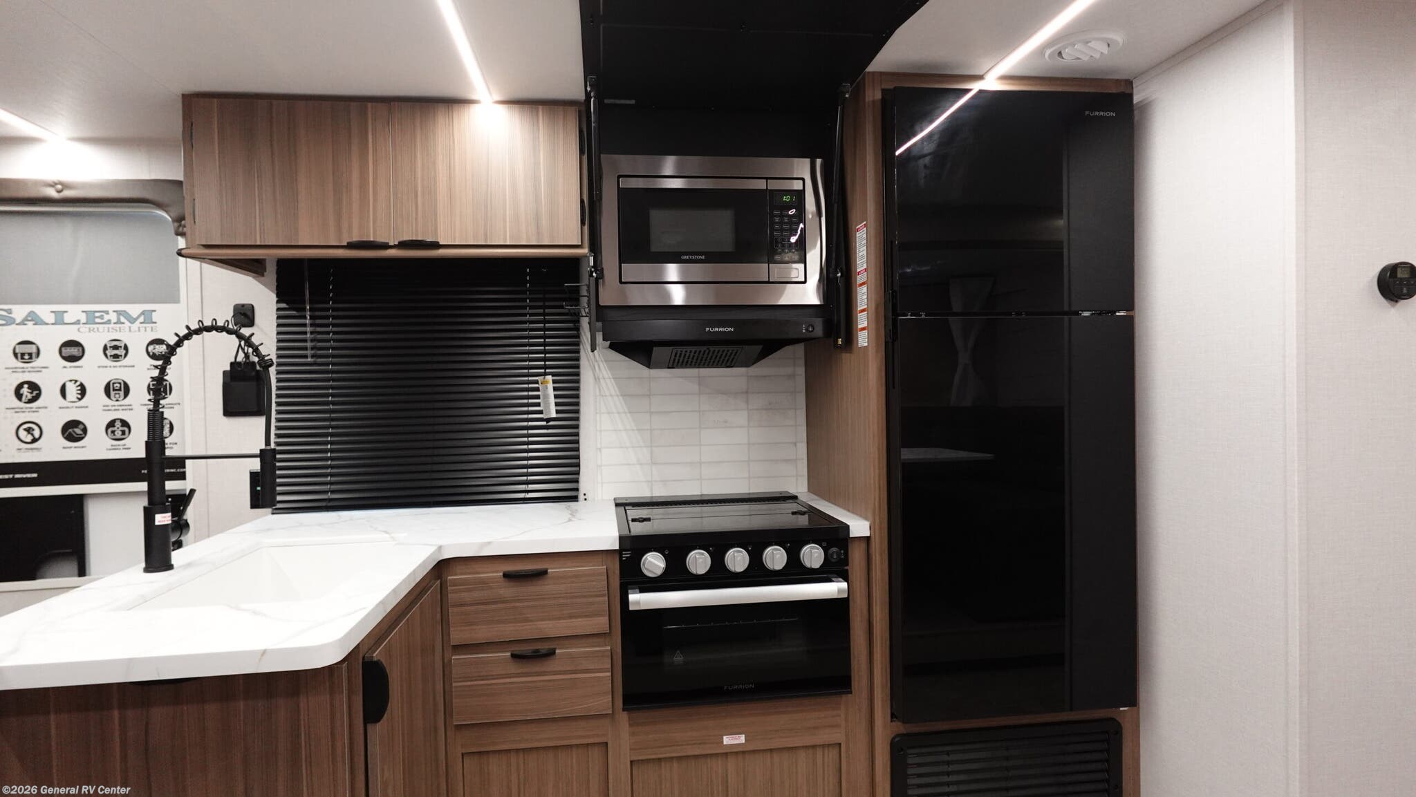 Experience the perfect blend of comfort and adventure with the 2026 Forest River Salem Cruise Lite 273QBXL. This travel trailer is designed to accommodate up to 11 sleepers, making it an ideal choice for families or groups looking to explore the great outdoors without sacrificing luxury. The spacious interior features a versatile king bed and three convertible sleeping options, ensuring everyone has a cozy spot to rest. The bunkhouse at the rear offers a fun and functional space for kids or guests, complete with a Jiffy sofa and fold-up bunk beds. The heart of this RV is its well-appointed center kitchen, equipped with a full-size electric refrigerator and a three-burner cooktop, perfect for preparing meals on the go. The adjacent living area boasts a panoramic window and a Versa Lounge, creating a welcoming space for relaxation or entertaining. Enjoy the convenience of a walk-in shower with a curtain in the center bath. Outside, the 16-foot powered retractable awning and exterior camp kitchen enhance your outdoor living experience, making it easy to enjoy meals and gatherings under the open sky. With a dry weight of 5,975 lbs and a cargo capacity of 1,705 lbs, this trailer is both robust and easy to tow. Whether you're embarking on a weekend getaway or a cross-country adventure, the Salem Cruise Lite 273QBXL is your home away from home. For more details or to see it in person, visit your nearest General RV dealership.
