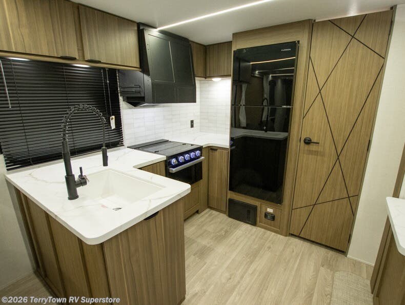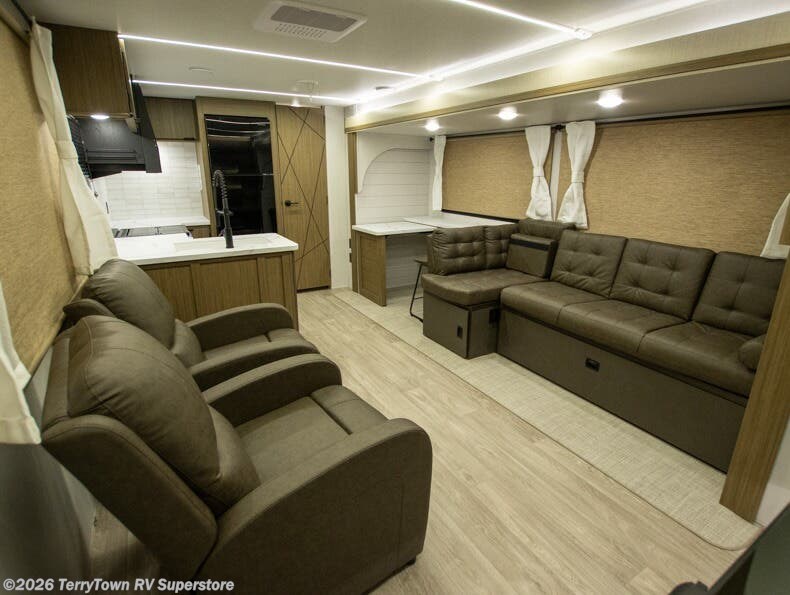 With a spacious kitchen and panoramic windows, this travel trailer is sure to stand out! The L-shaped Versa lounge, dual lounge chairs, and Versa Flex table give you many seating options. You can either cook a delicious meal in the rear kitchen, or you can use the exterior camp kitchen to breathe in some fresh air while you cook. After a fun-filled day, you can rinse off in the walk-in shower then head to the front private bedroom, grab your pajamas from the closet, and lay down on the custom king bed with Versa Tilt for a good night's rest!