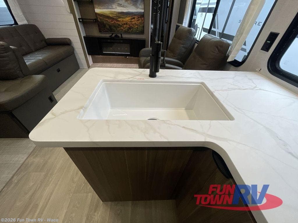 With a spacious kitchen and panoramic windows, this travel trailer is sure to stand out! The L-shaped sofa, dual lounge chairs, and Versa Flex table give you many seating options. You can either cook a delicious meal in the rear kitchen or you can use the exterior camp kitchen to breathe in some fresh air while you cook. After a fun-filled day, you can rinse off in the walk-in shower then head to the front private bedroom, grab your pajamas from the closet, and lay down on the custom king bed with Versa Tilt for a good night's rest!