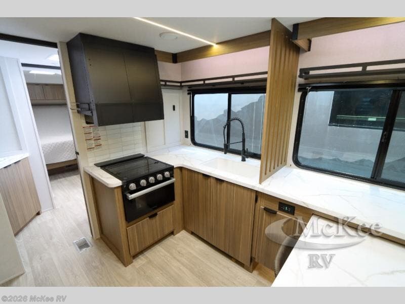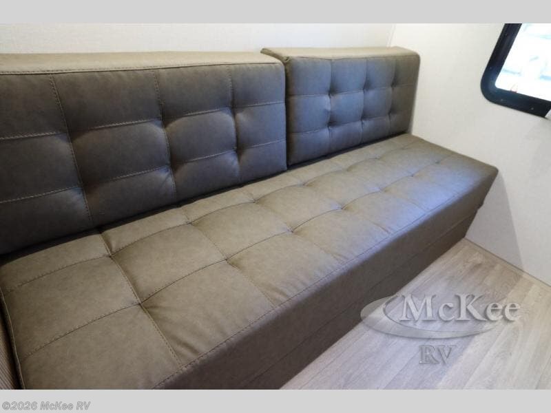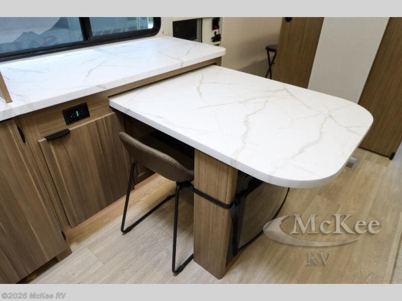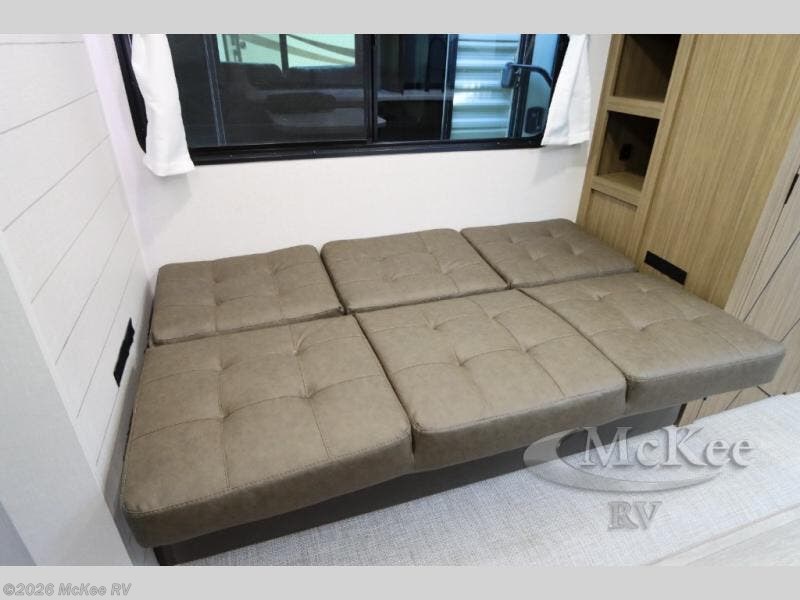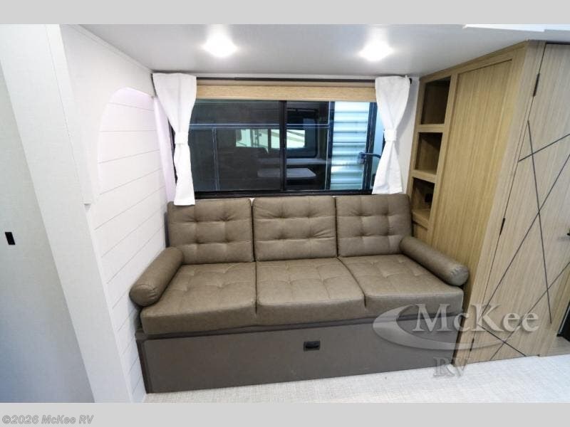 Everyone will enjoy having their own space in this travel trailer thanks to the front master bedroom and the rear bunkhouse. The bunkhouse includes a wall to separate the Versa bunk and fold-down desk on one side and a Versa sofa on the other, perfect for older kids or guests. You'll have the custom king bed with Versa Tilt all to yourselves, and the walk-thru bath will be easily accessible for everyone. In the combined kitchen and living room, a jackknife sofa slide sits across from the fireplace/entertainment center, and there is a pull-out table here so you can dine together.