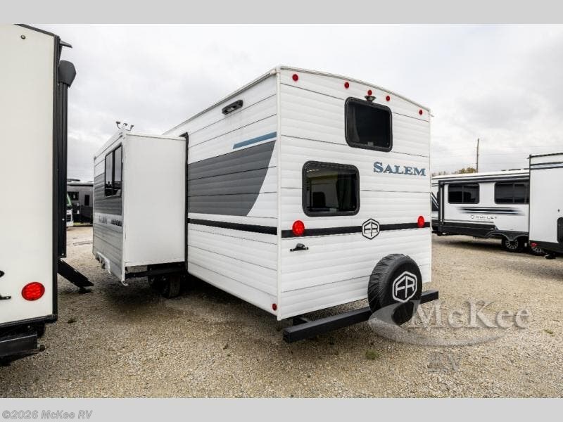 The Salem travel trailers are packed with hassle-free camping amenities and there are a variety of floorplans to choose from. The heated and enclosed Accessibelly will help protect against the elements and debris during transport, and the exterior retro/metal redesign is sure to be eye-catching! There are stylish roller shades inside, along with updated backsplash, elegant curtain rods and curtains, plus many more interior comforts! Choose a Salem travel trailer today for quality and value!