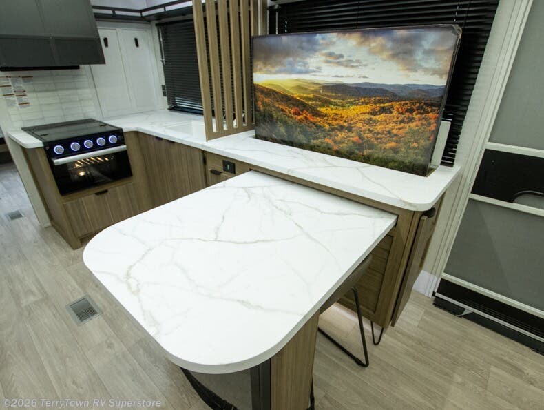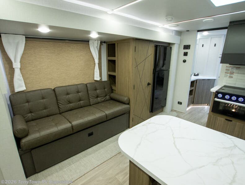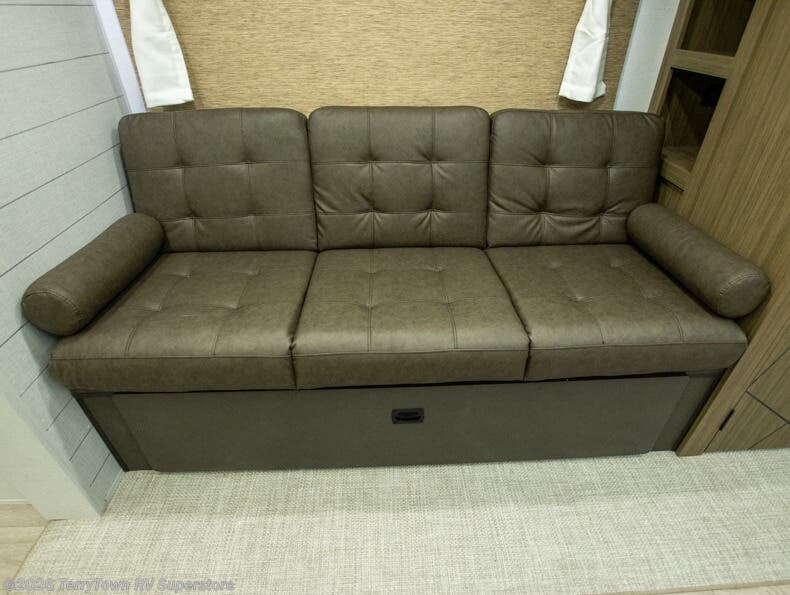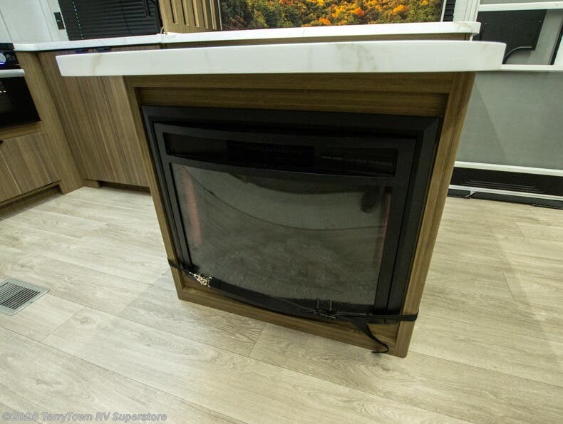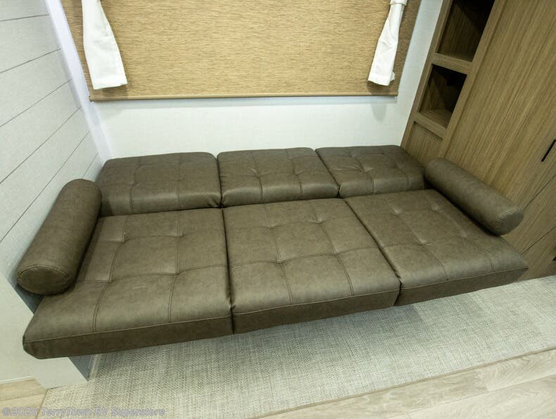 Everyone will enjoy having their own space in this travel trailer thanks to the front master bedroom and the rear bunkhouse. The bunkhouse includes a wall to separate the Versa bunk and fold-down desk on one side and a Versa sofa on the other, perfect for older kids or guests. You'll have the custom king bed with Versa Tilt all to yourselves, and the walk-thru bath will be easily accessible for everyone. In the combined kitchen and living room, a jackknife sofa slide sits across from the fireplace/entertainment center, and there is a pull-out table here so you can dine together.