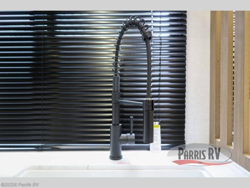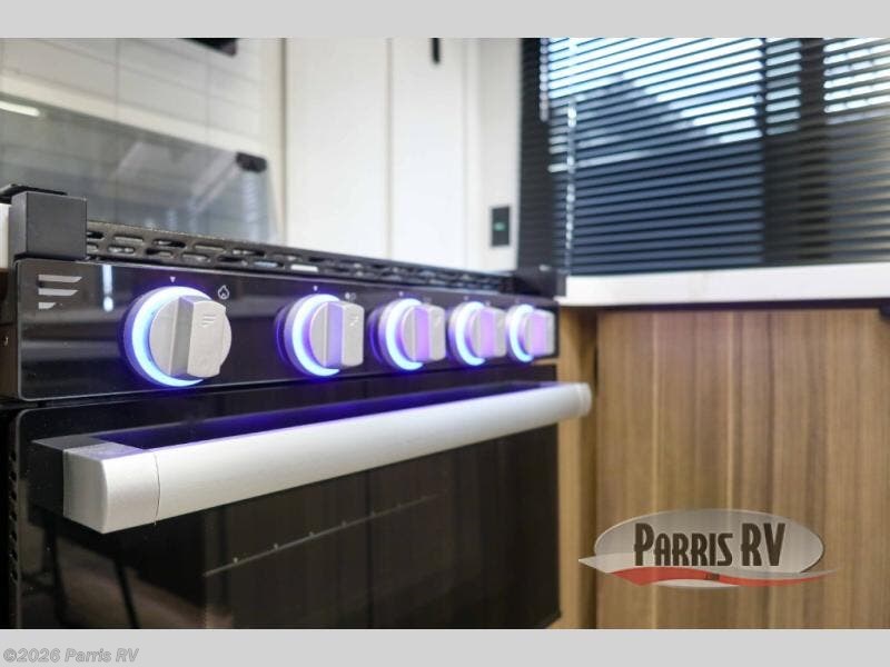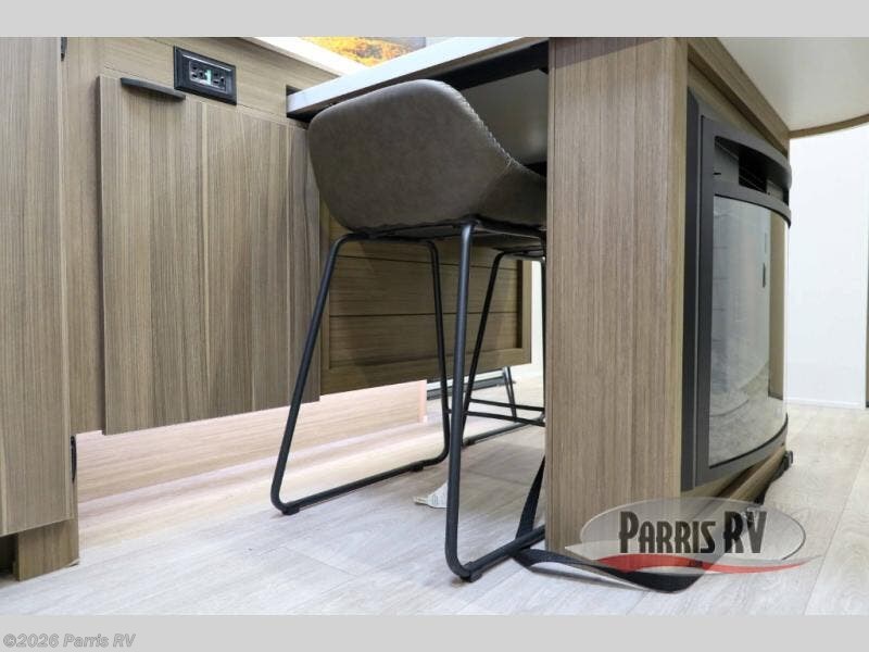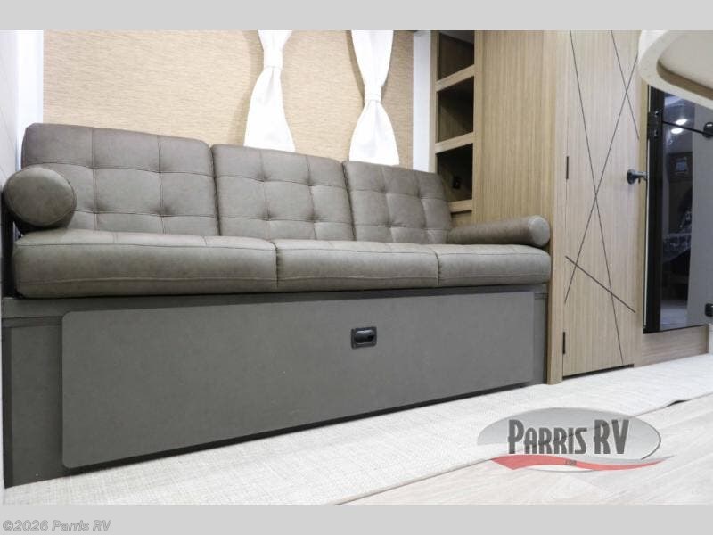 Everyone will enjoy having their own space in this travel trailer thanks to the front master bedroom and the rear bunkhouse. The bunkhouse includes a wall to separate the Versa bunk and fold-down desk on one side and a Versa sofa on the other, perfect for older kids or guests. You'll have the custom king bed with Versa Tilt all to yourselves, and the walk-thru bath will be easily accessible for everyone. In the combined kitchen and living room, a jackknife sofa slide sits across from the fireplace/entertainment center, and there is a pull-out table here so you can dine together.