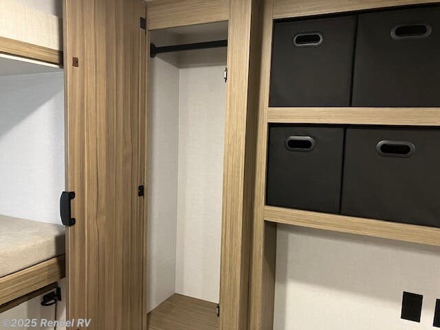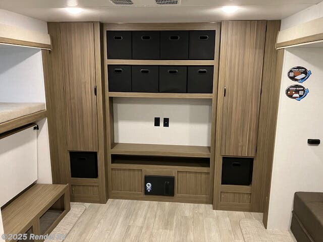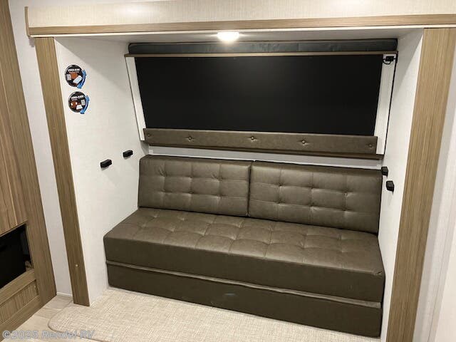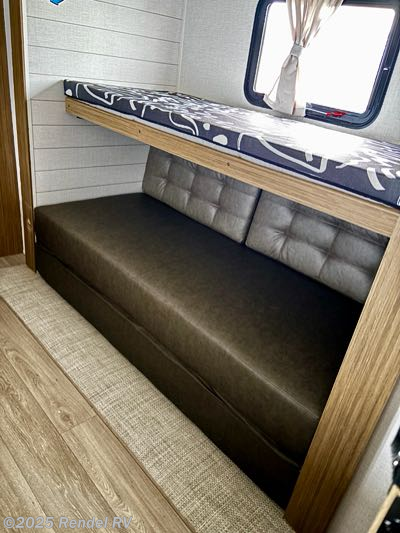 The kitchen is equipped with an 11 cu ft refrigerator, an oven with a stovetop, a microwave, and ample cabinet space for all your culinary needs. With a water heater and reliable air conditioning, comfort is assured whether you’re parked at a campground or boondocking off the grid. The bunkhouse provides a dedicated play or relaxation area for kids, enhancing family time on the road.