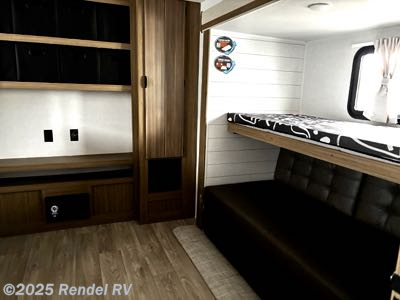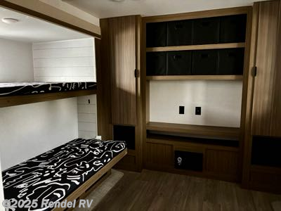 The 31KQBTS features three slideouts that expand living space, plus oversized panoramic windows for natural light. The bunkhouse setup provides flexible sleeping areas, while the front bedroom offers a king-size bed and generous storage. The main living area includes a Versa-Lounge with a U-dinette and a 50-inch flat-screen TV, creating a welcoming hub for family time. A cozy fireplace option adds ambiance on cool evenings inside this versatile travel trailer.
