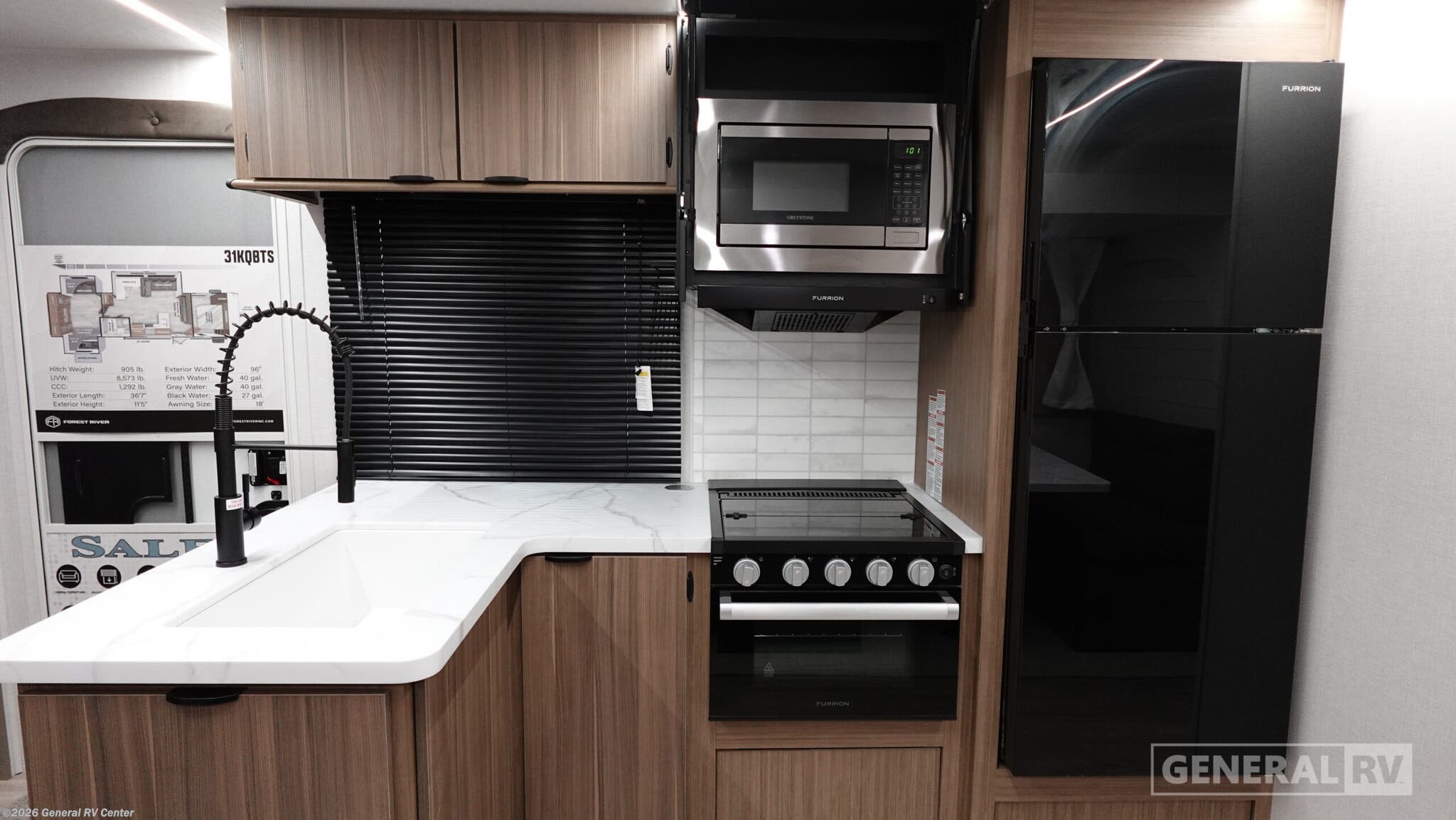 Forest River Salem travel trailer 31KQBTS highlights: Spacious Bunkhouse Outdoor Kitchen L-Shaped Versa Lounge Triple Slides Custom King Bed with Versa Tilt The rear private bunkhouse in this Salem travel trailer is super accommodating for your kids or your overnight guests! It has two opposing slides which provide extra floor space and a full-width closet/entertainment center which delivers extra space for backpacks and tennis shoes. The front private bedroom will be perfect for you with its custom king bed and dual closets, and any additional guests can sleep on the L-shaped versa lounge. There is also a Versa Flex table here to dine at or get some work done. Everyone will enjoy their own space when it's time to freshen up in the full bath with a walk-in shower, and the chef of the group will have all the appliances needed to make meals each day. And don't forget about the outdoor kitchen for outdoor fun! The Salem travel trailers are packed with hassle-free camping amenities! There are a variety of floorplans to choose from between three different regions. The heated and enclosed Accessibelly will help protect against the elements and debris during transport, and the exterior retro/metal redesign is sure to be eye-catching! There are stylish roller shades inside, along with updated backsplash, elegant curtain rods and curtains, plus many more interior comforts! Choose a Salem travel trailer today for quality and value!