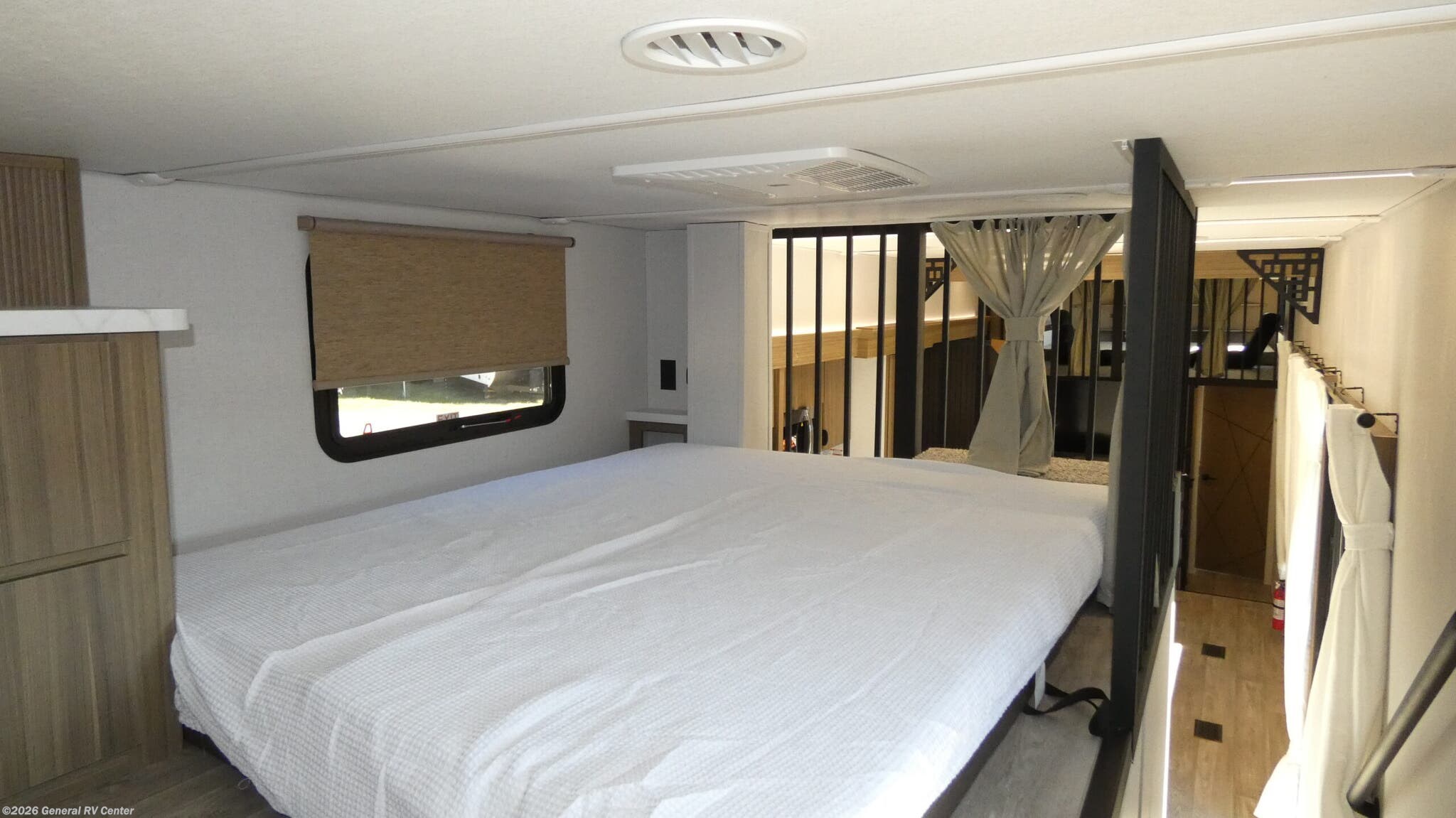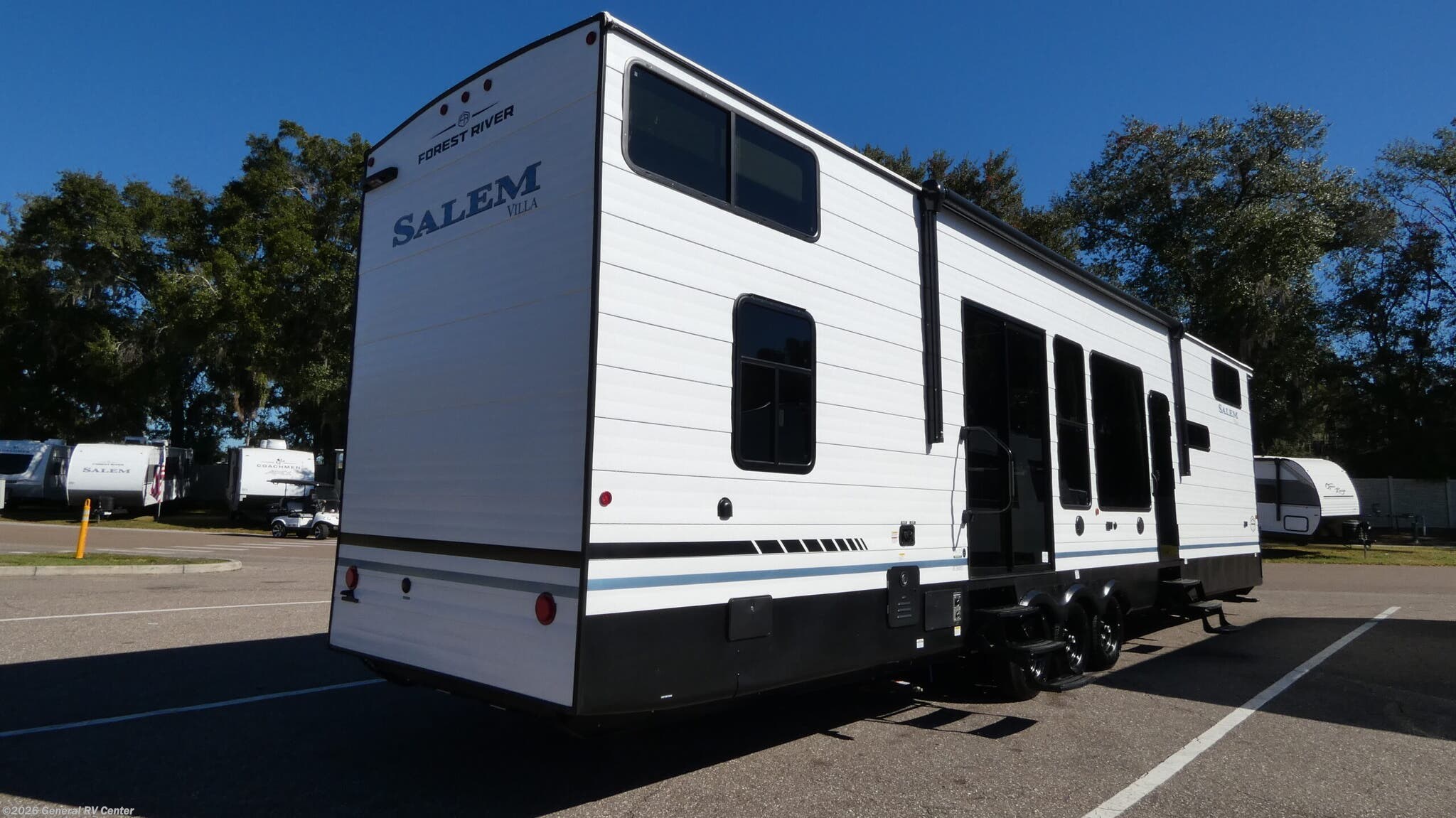 2026 Forest River Salem Villa 40ZZZ Highlights: Two King Beds Two Full Baths Loft Sleeps up to 10 This luxury destination trailer floorplan is designed for extended stays, seasonal living, or full-time comfort, offering a unique dual private bedroom layout with residential features throughout. At both ends of the trailer, you’ll find spacious Versa-Tilt custom king beds, each paired with its own entertainment center, dresser, overhead storage, and dedicated closet space, providing true bedroom suites for owners and guests alike. Each bedroom is conveniently positioned next to a full bathroom with a walk-in shower, creating a rare and highly desirable two-bathroom design that adds privacy and comfort—ideal for couples, families, or shared seasonal use. Linen storage and raised wardrobe space further enhance functionality and organization. The central living and kitchen area serves as the heart of the trailer, featuring a residential-style kitchen with a full refrigerator, pantry, overhead cabinetry, microwave, and a large island with integrated sink for meal prep and entertaining. A 72" sofa faces the centrally located entertainment center and fireplace, creating a cozy gathering space that feels more like a park model or small apartment than a traditional RV. Additional sleeping flexibility is provided by a queen mattress loft area, accessible by steps, making this floorplan perfect for accommodating guests or grandchildren without sacrificing main living space. With its wide-open living area, opposing king bedroom suites, dual bathrooms, and residential kitchen, this destination trailer delivers unmatched comfort and livability—making it an excellent choice for seasonal sites, lake lots, or long-term campground stays.