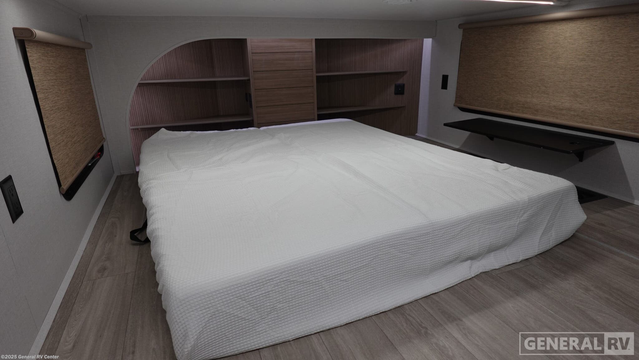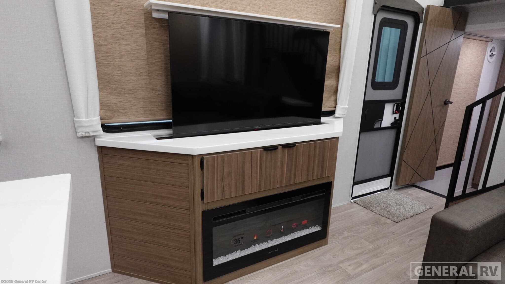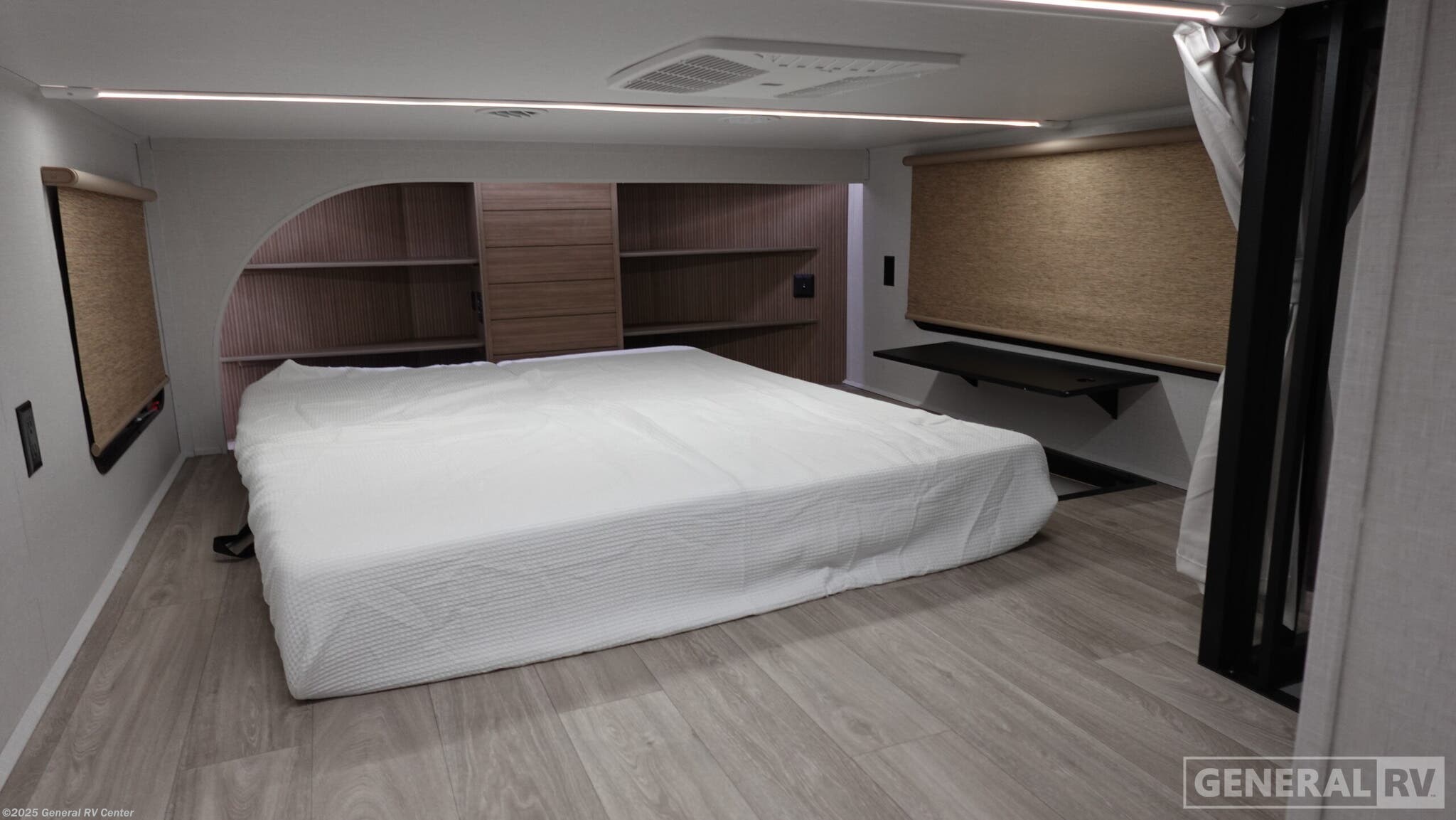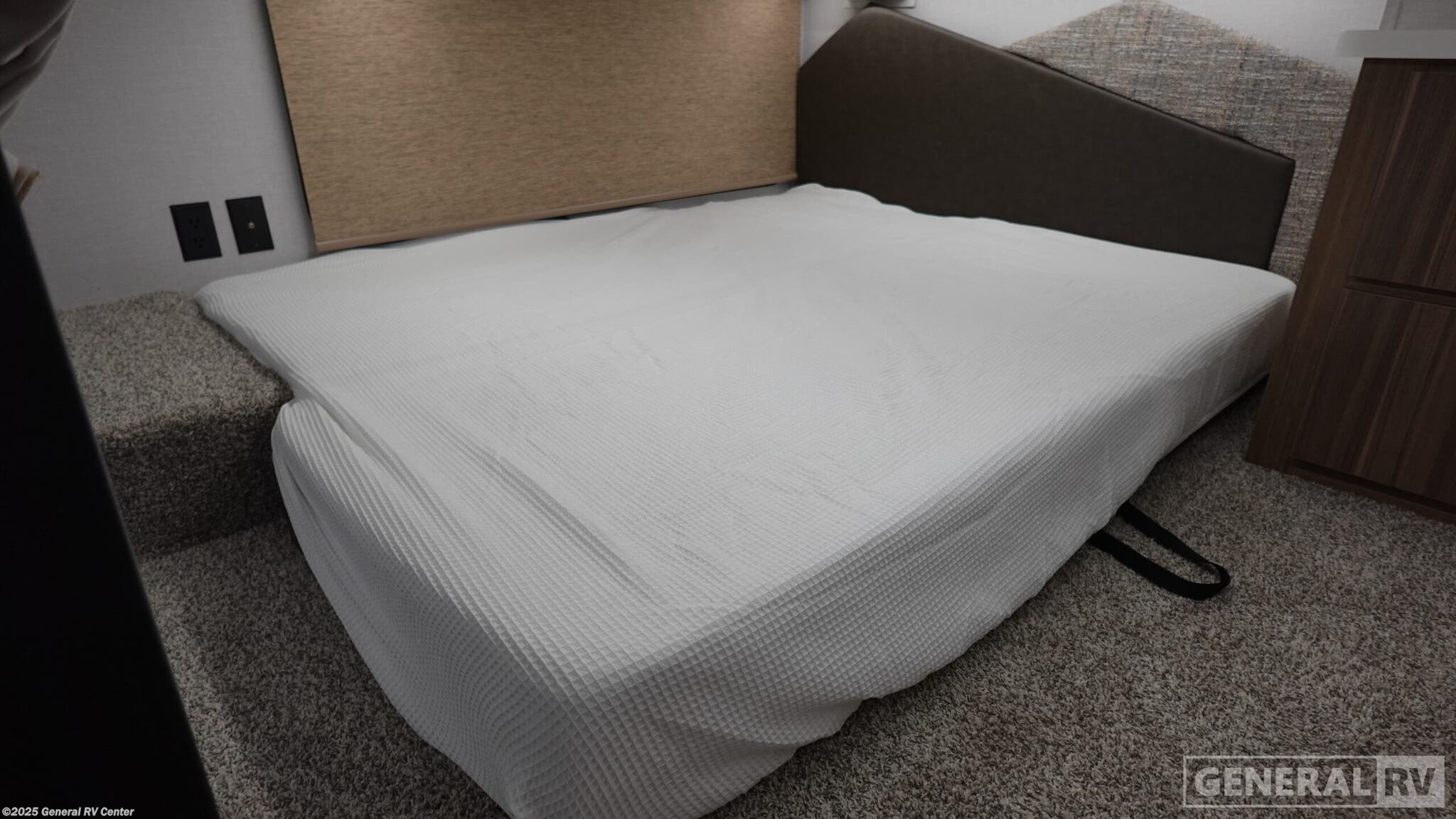 Forest River Salem Grand Villa destination trailer 42ZEN highlights: Two Lofts Steps to Loft Fireplace Two Bathrooms This thoughtfully designed 42ZEN model provides a blend of comfort and functionality. It features two lofts for added sleeping and living space, one includes a king mattress and a dresser for storing clothes and essentials, while the second loft offers another Versa queen bed, plus a table with recessed footing, perfect for getting work or study done on the road. There is also a cabinet and shelf to keep everything organized. On the main floor, you'll find a large rear full bathroom, complete with a walk-in shower, linen closet, and washer/dryer, providing all the comforts of home. The main living area centers around a large sectional sofa with room for the whole crew, facing a fireplace and Televator TV, making it the perfect space to relax after a long day. The kitchen island also adds valuable prep space and also serves as a gathering spot with room for stools. Up front, the master bedroom features a king-size bed with Versa Tilt, a dresser, and its own private bathroom, offering convenience and privacy whenever you need it. With any Salem Grand Villa destination trailer by Forest River, you can call home wherever you park it! There is a heated and enclosed Accessibelly for added protection, LED "Blade Lighting" under the awning, Lippert On-The-Go ladder prep, plus many more exterior conveniences. Elegant curtain rods and curtains will have you feeling right at home, along with stainless steel kitchen appliances, stylish roller shades, and enhanced floating shelves for added storage. Each model includes heavy duty cabinet hinges for safety and durability, a 60k on-demand tankless water heater for endless hot showers, a JBL 3-Zone media center, plus available options to further customize your trailer.