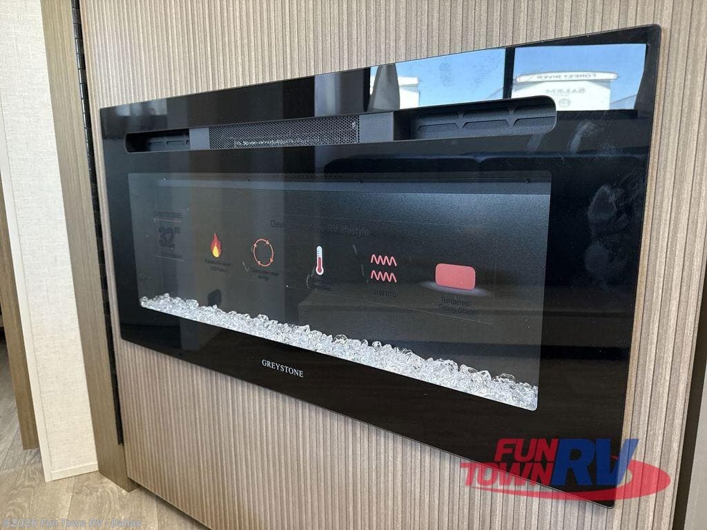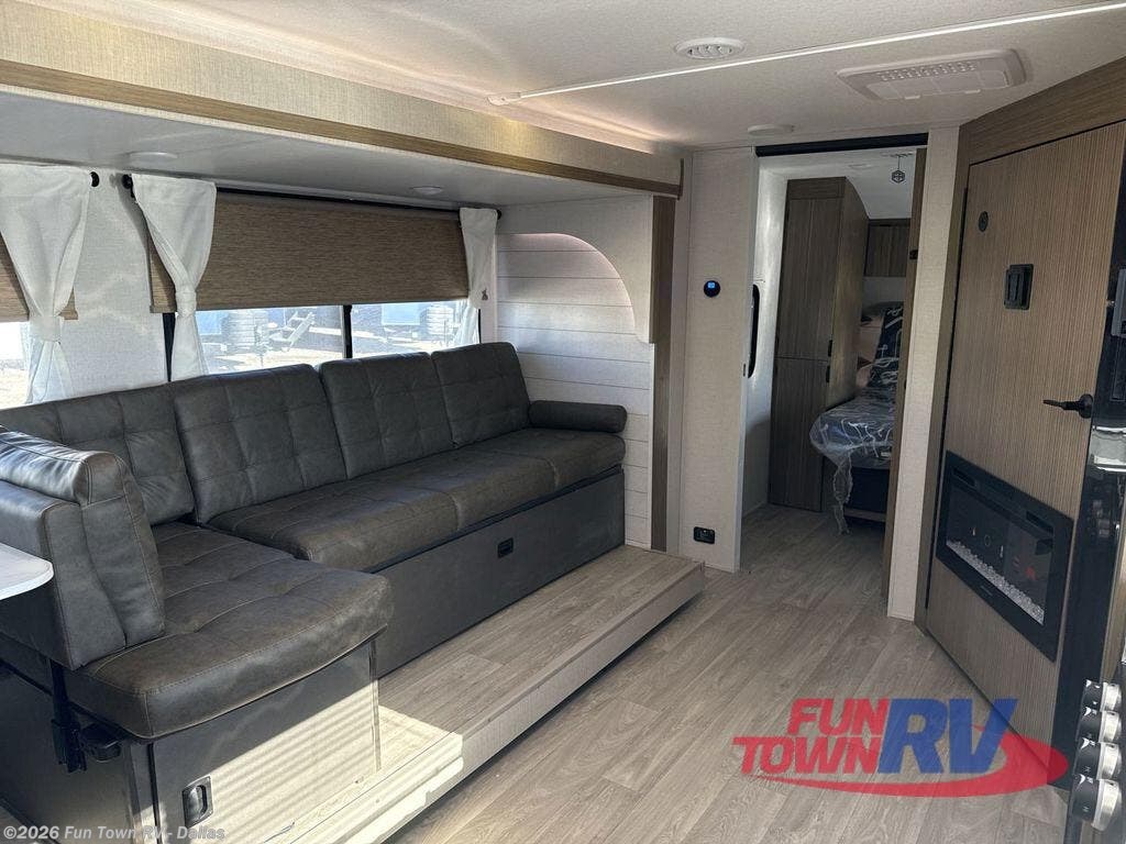 You're sure to make camping memories in this spacious travel trailer! You can easily sleep eight people each night thanks to the double-size bunks, the custom king bed with Versa Tilt in the front bedroom plus the Versa-Lounge within the large slide out! The cooktop and microwave oven will let you make meals each day, and you'll appreciate the hidden pantry with shelves behind the fireplace. There is also a booth dinette where you can dine together or play a game of cards after dinner is cleaned up, or you may just find yourselves outdoors under the 18' awning with 4K blade lighting. And don't overlook the full bath, complete with a tub/shower that will make bath time easier if you have little ones.