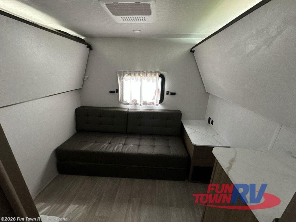 This travel trailer is new to the lineup and offers a large amount of versatility! The rear private bunkhouse has two 30" x 74" Versa-bunks and a Versa-queen bed so that more can join in on the camping fun. Start each morning feeling clean and fresh after showering in the walk-in shower with fiberglass surround then head to the front private bedroom to change. The kitchen has an oversized refrigerator to keep your perishables fresh, a cooktop for meals, and a U-shaped dinette for dining, game time, or just hanging out.