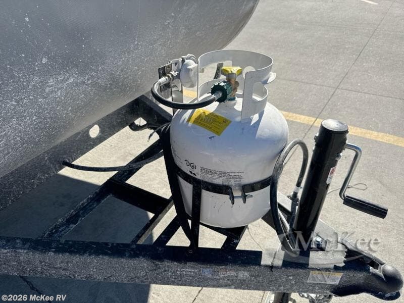 This lightweight travel trailer has everything you need to enjoy camping trips! There is a front east to west custom king bed with storage at the foot of the bed and overhead for your valuables. A private bath includes a toilet and walk-in shower so you can easily get ready each day, and you can prepare your meals on the two-burner cooktop when you get hungry. The booth dinette will provide dining space, along with sleeping space for one to two little ones. Don't let this trailer get away!