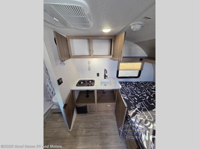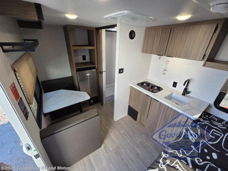 This lightweight travel trailer has everything you need to enjoy camping trips! There is a front east to west custom king bed with storage at the foot of the bed and overhead for your valuables. A private bath includes a toilet and walk-in shower so you can easily get ready each day, and you can prepare your meals on the two-burner cooktop when you get hungry. The booth dinette will provide dining space, along with sleeping space for one to two little ones. Don't let this trailer get away!