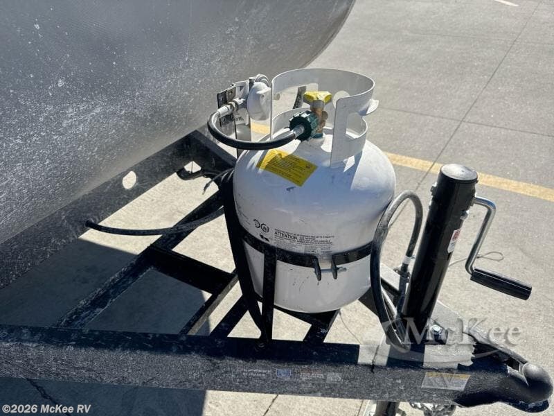 This lightweight travel trailer has everything you need to enjoy camping trips! There is a front east to west custom king bed with storage at the foot of the bed and overhead for your valuables. A private bath includes a toilet and walk-in shower so you can easily get ready each day, and you can prepare your meals on the two-burner cooktop when you get hungry. The booth dinette will provide dining space, along with sleeping space for one to two little ones. Don't let this trailer get away!