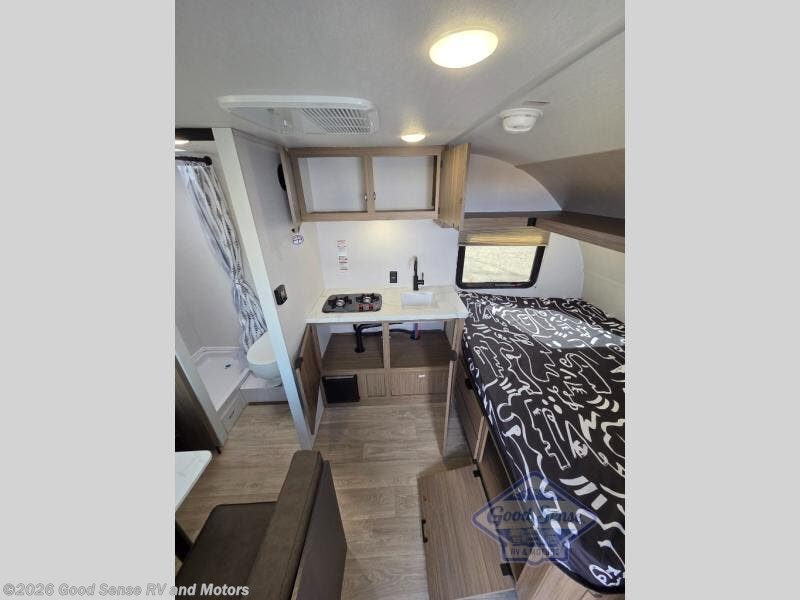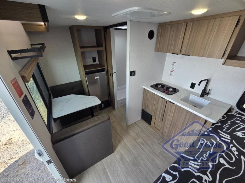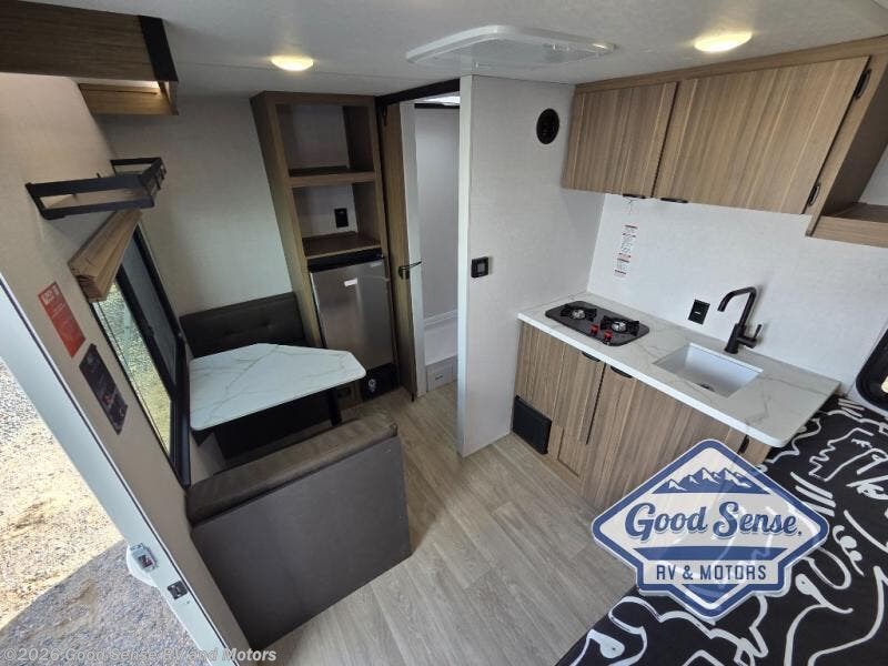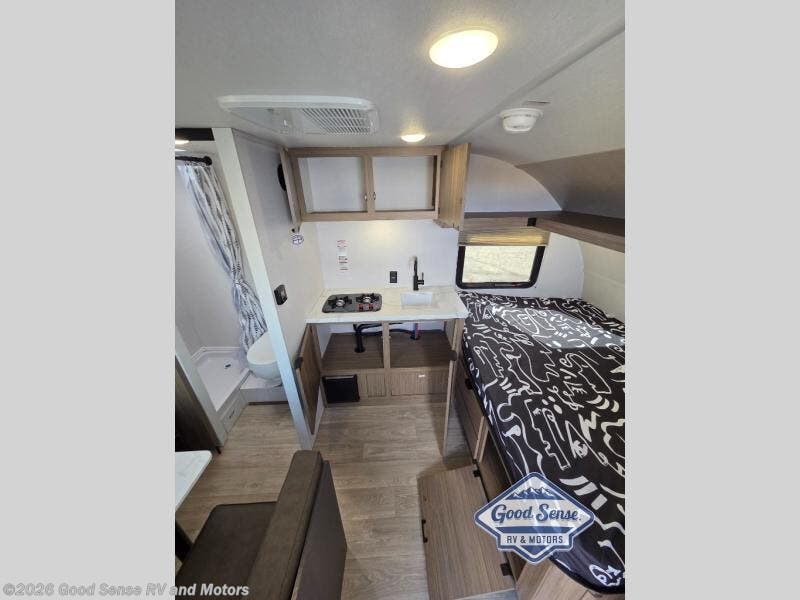 This lightweight travel trailer has everything you need to enjoy camping trips! There is a front east to west custom king bed with storage at the foot of the bed and overhead for your valuables. A private bath includes a toilet and walk-in shower so you can easily get ready each day, and you can prepare your meals on the two-burner cooktop when you get hungry. The booth dinette will provide dining space, along with sleeping space for one to two little ones. Don't let this trailer get away!