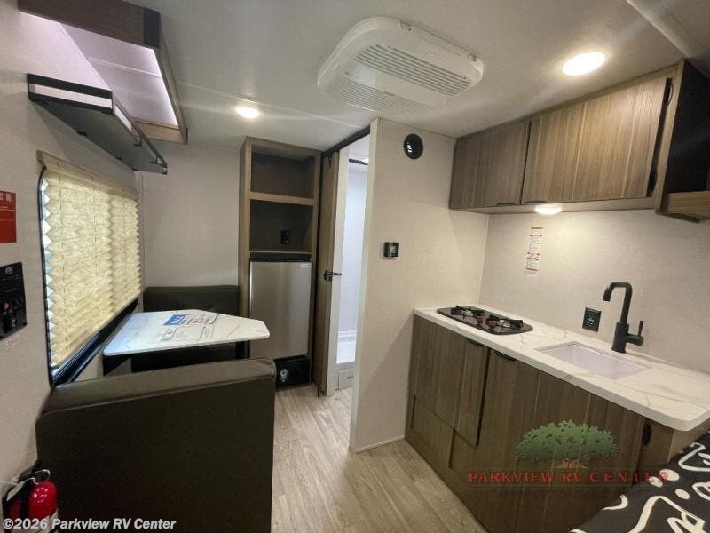This lightweight travel trailer has everything you need to enjoy camping trips! There is a front east to west custom king bed with storage at the foot of the bed and overhead for your valuables. A private bath includes a toilet and walk-in shower so you can easily get ready each day, and you can prepare your meals on the two-burner cooktop when you get hungry. The booth dinette will provide dining space, along with sleeping space for one to two little ones. Don't let this trailer get away!