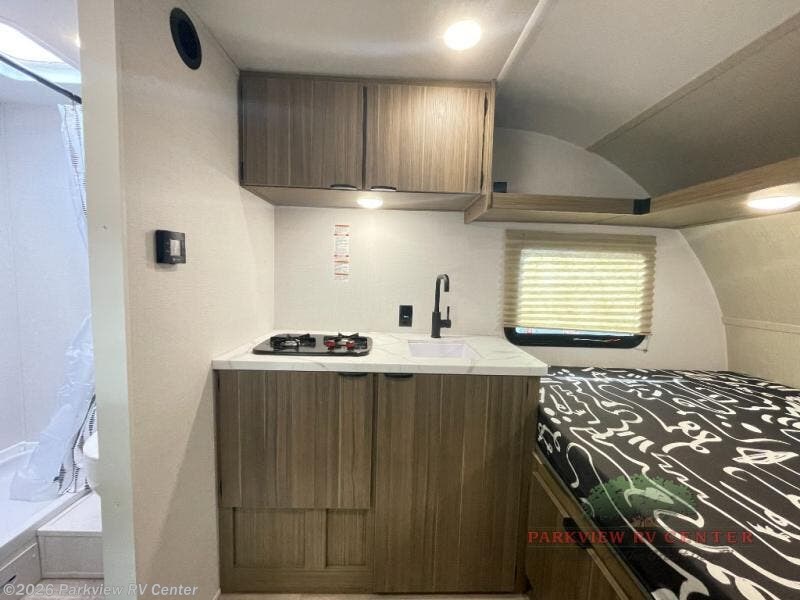 This lightweight travel trailer has everything you need to enjoy camping trips! There is a front east to west custom king bed with storage at the foot of the bed and overhead for your valuables. A private bath includes a toilet and walk-in shower so you can easily get ready each day, and you can prepare your meals on the two-burner cooktop when you get hungry. The booth dinette will provide dining space, along with sleeping space for one to two little ones. Don't let this trailer get away!