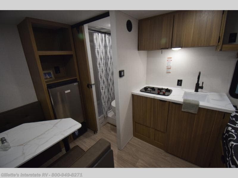 This lightweight travel trailer has everything you need to enjoy camping trips! There is a front east to west custom king bed with storage at the foot of the bed and overhead for your valuables. A private bath includes a toilet and walk-in shower so you can easily get ready each day, and you can prepare your meals on the two-burner cooktop when you get hungry. The booth dinette will provide dining space, along with sleeping space for one to two little ones. Don't let this trailer get away!