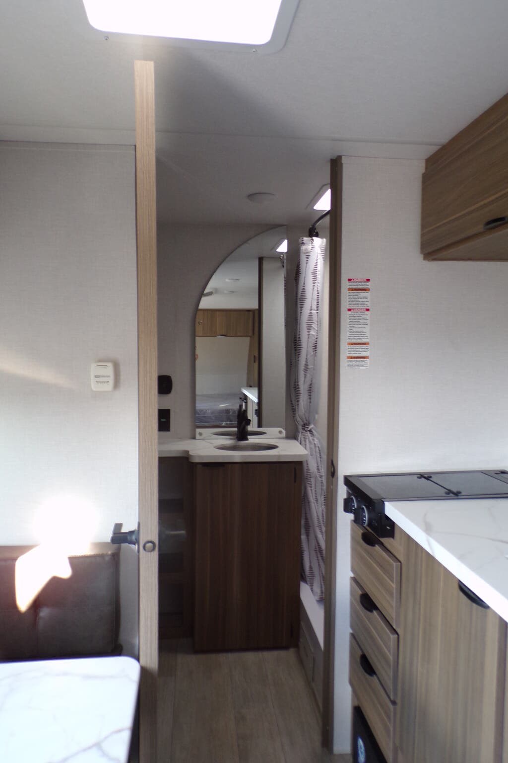 Sink in the bathroom! Lots of counter space in both the bathroom and kitchen! Closets on both sides of the bed! Top seller!!