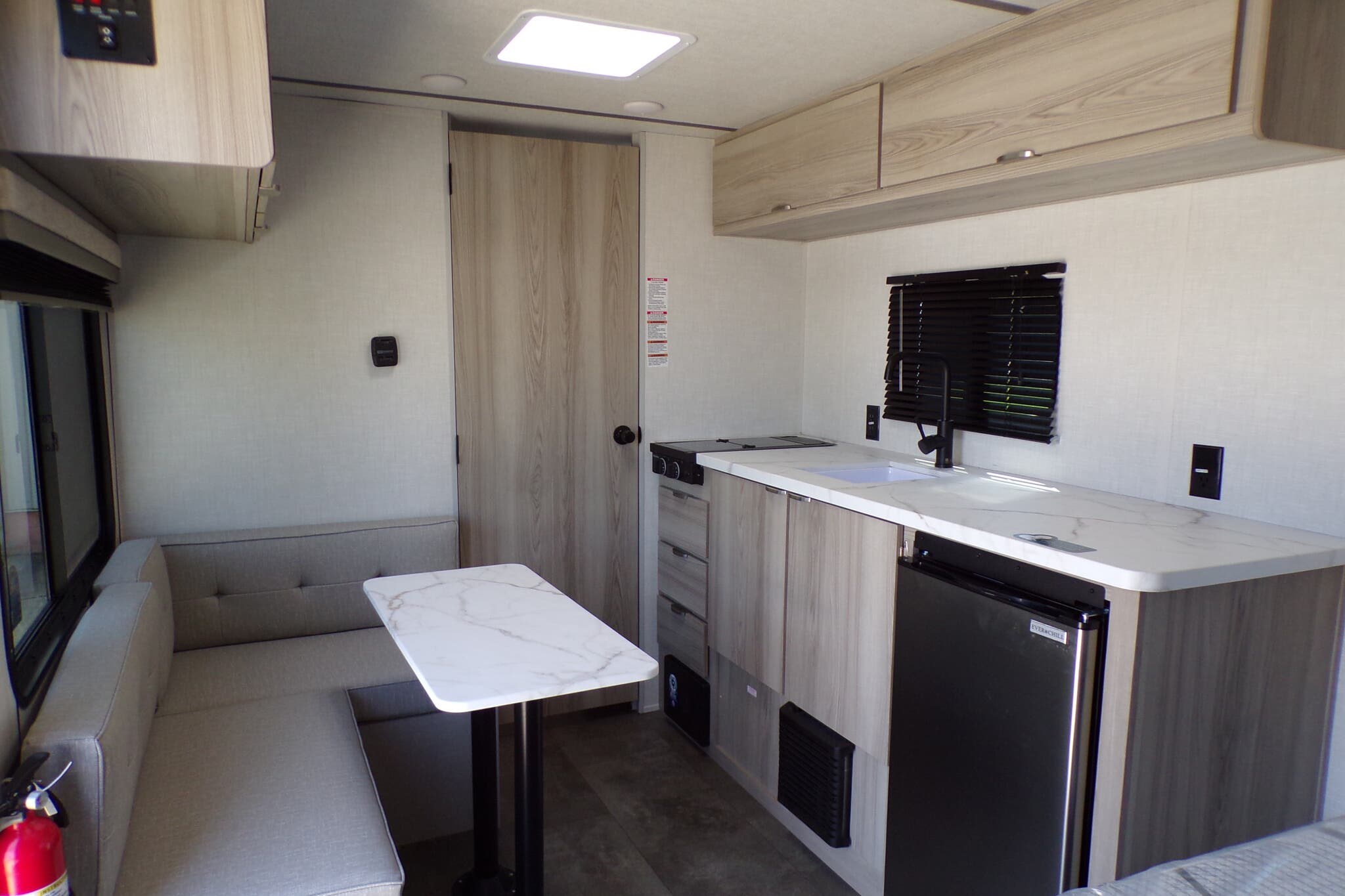 Designed with convenience in mind, the RV includes essential safety and security features such as a CO detector, LP detector, smoke detector, and fire extinguisher. Outside, enjoy the ease of setup with leveling jacks and a power roof vent, plus a large awning to provide shaded outdoor space.