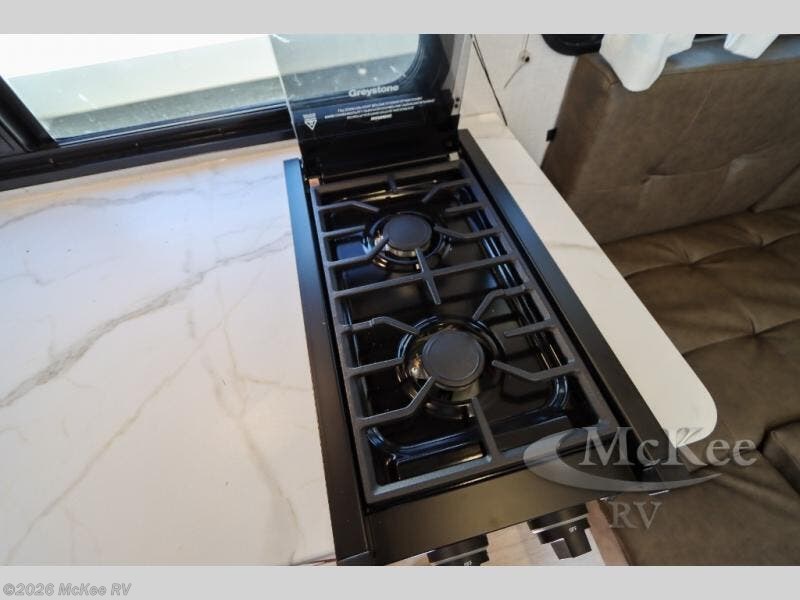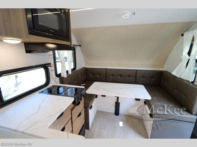 This travel trailer is perfect for couples who want to explore the great outdoors together! There is a rear private bedroom with a queen bed slide for more interior space, a dresser and wardrobes on either side of it for your clothes. Plus, it enters right into the split style bathroom which will come in handy when one person wants to freshen up in the shower while another uses the private toilet and sink. You can prepare your best home cooked meals with the two burner cooktop then enjoy it at the front U-shaped dinette which can also transform into an extra sleeping space. Enjoy making pancakes on the outdoor kitchen under the 15' power awning!