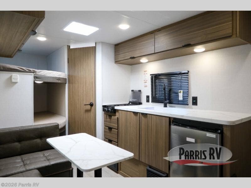 The double-size bunks with storage will be a big selling point in this travel trailer! While your guests take the bunks, you can have the front queen bed all to yourselves, and there is a wardrobe to keep your things organized. A two burner cooktop and microwave will let you make meals each day, and you can dine at the open lounge with a table.