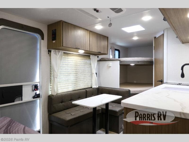 The double-size bunks with storage will be a big selling point in this travel trailer! While your guests take the bunks, you can have the front queen bed all to yourselves, and there is a wardrobe to keep your things organized. A two burner cooktop and microwave will let you make meals each day, and you can dine at the open lounge with a table.