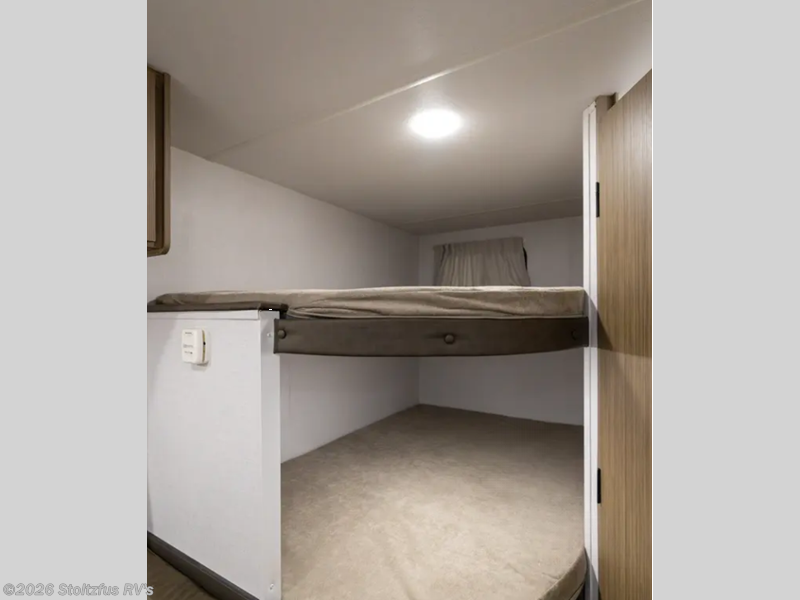 The double-size bunks with storage will be a big selling point in this travel trailer! While your guests take the bunks, you can have the front queen bed all to yourselves, and there is a wardrobe to keep your things organized. A two burner cooktop and microwave will let you make meals each day, and you can dine at the open lounge with a table.