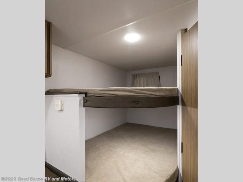 The double-size bunks with storage will be a big selling point in this travel trailer! While your guests take the bunks, you can have the front queen bed all to yourselves, and there is a wardrobe to keep your things organized. A two burner cooktop and microwave will let you make meals each day, and you can dine at the open lounge with a table.